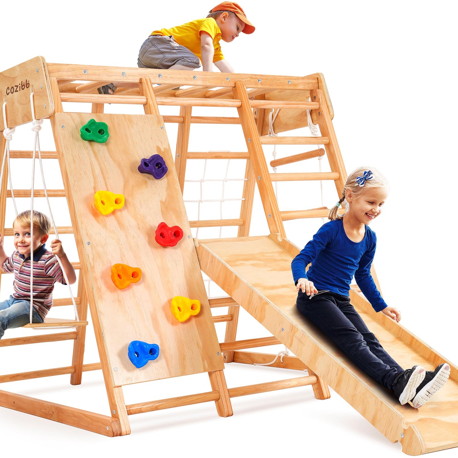 - 【7-in-1 Indoor Jungle Gym Playground】The CoziBB wooden toddler jungle gym indoor comes with the rock climbing wall, slide, monkey bars, rope ladder,rope wall, wood ladder, and swing. Features up to 7 different ways for your kids to explore. Our kids playset not only provides children with joyous playtime but also helps them develop and enhance their motor skills during play