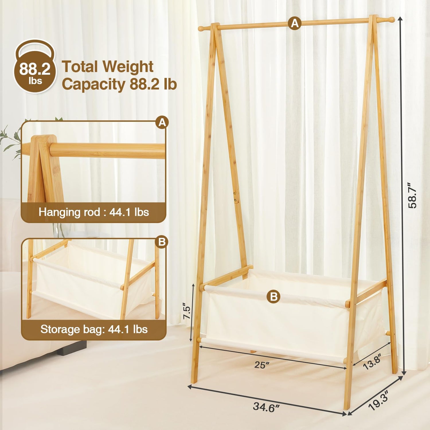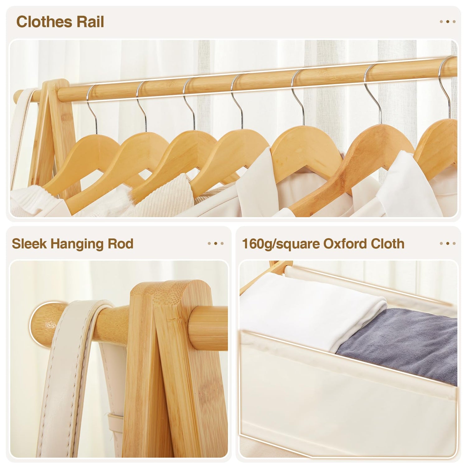 Cozivolife Bamboo Clothes Rack with Storage Box, Garment Rack Clothing Racks for Hanging Clothes, Foldable Wardrobe Storage Rack for Entryway and Bed Room (Natural)