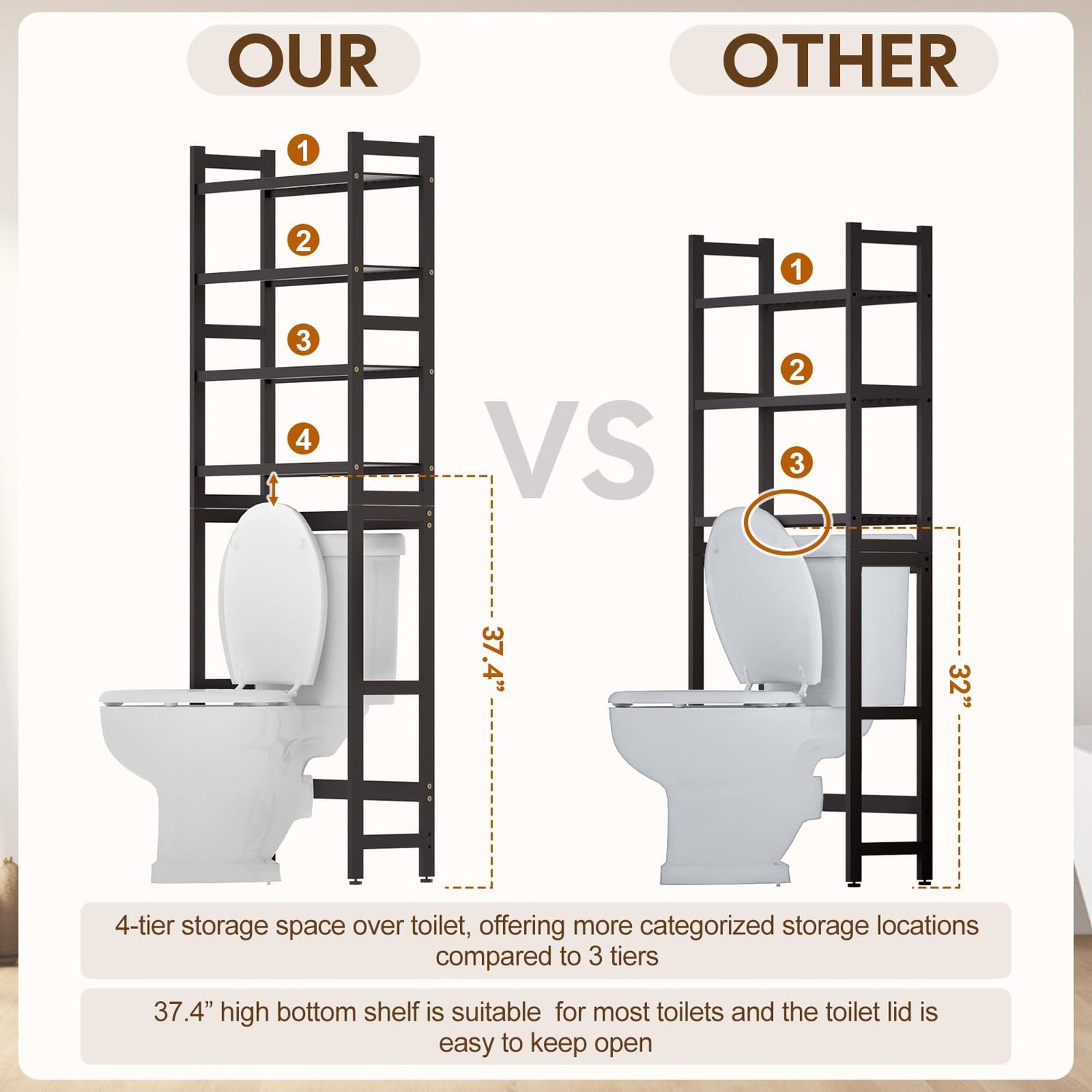 - 4 Tier Over the Toilet Storage: Our over the toilet storage has 4 valuable storage spaces above it, which can fully utilize your bathroom space to store toilet paper, shower gel, aromatherapy, and other items, increasing the bathroom storage area. It allows easy access to towels, tissue paper, or cosmetics without taking up additional floor space