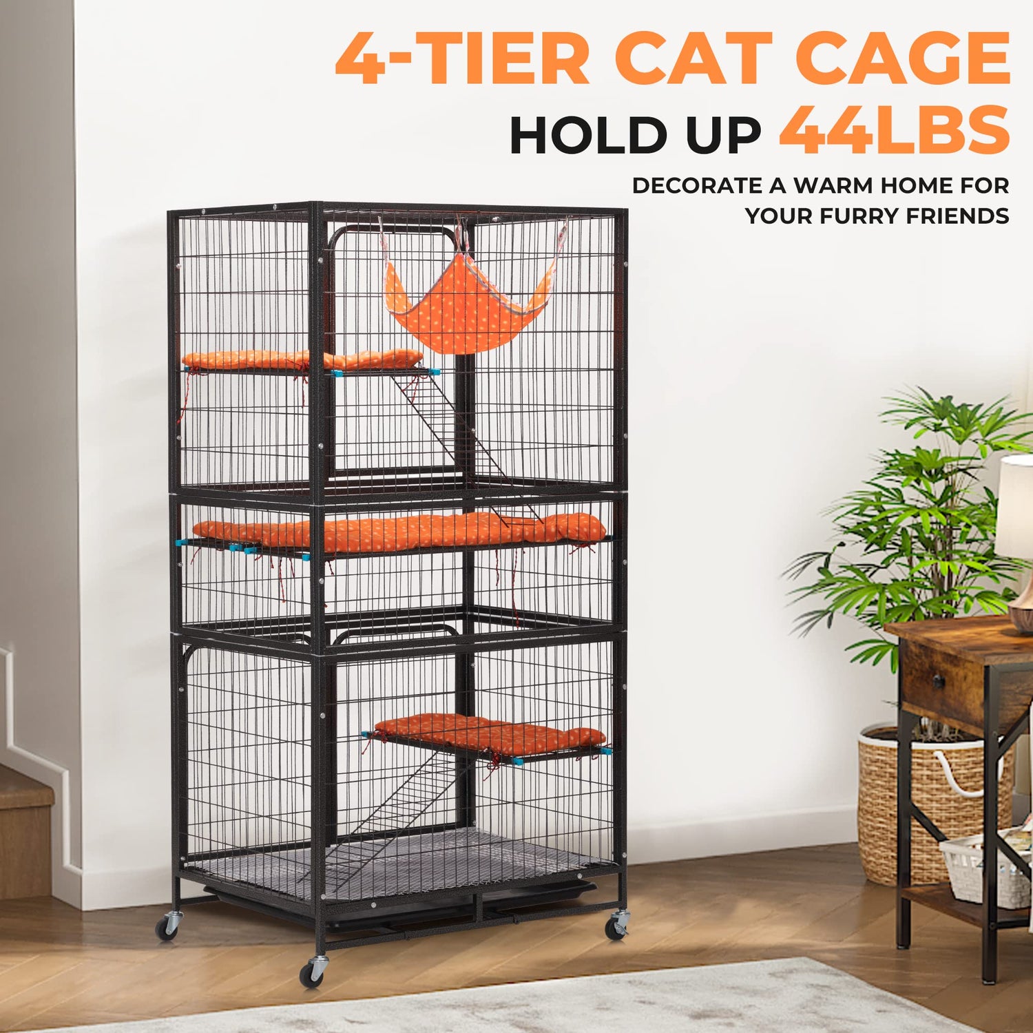 COZIVVOVV Large Cat Cage Indoor, 4-Tier Cat Enclosure Indoor with Hammock Bed, Cat Crates with 2 Ladders, Durable Wire Mesh Catios for Cats, Pet Cages for Cats with Wheels, Black