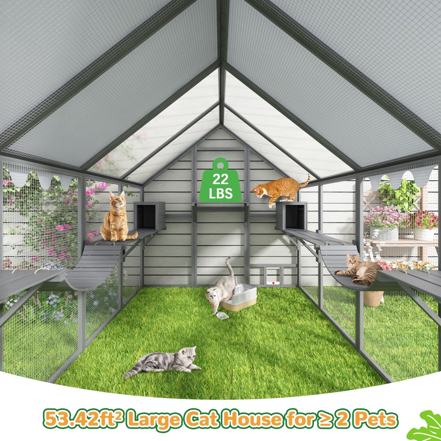 - 【All-Weather Protection】Designed with a fully covered roof constructed with 4 durable sunshine boards and 1 removable pvc oxford cloth, the extra-large outdoor catio delivers a refreshing shade during bright sunny days and shields your pets from winds, rain, and snow. Give your feline companions the freedom to explore nature safely, no matter the weather conditions