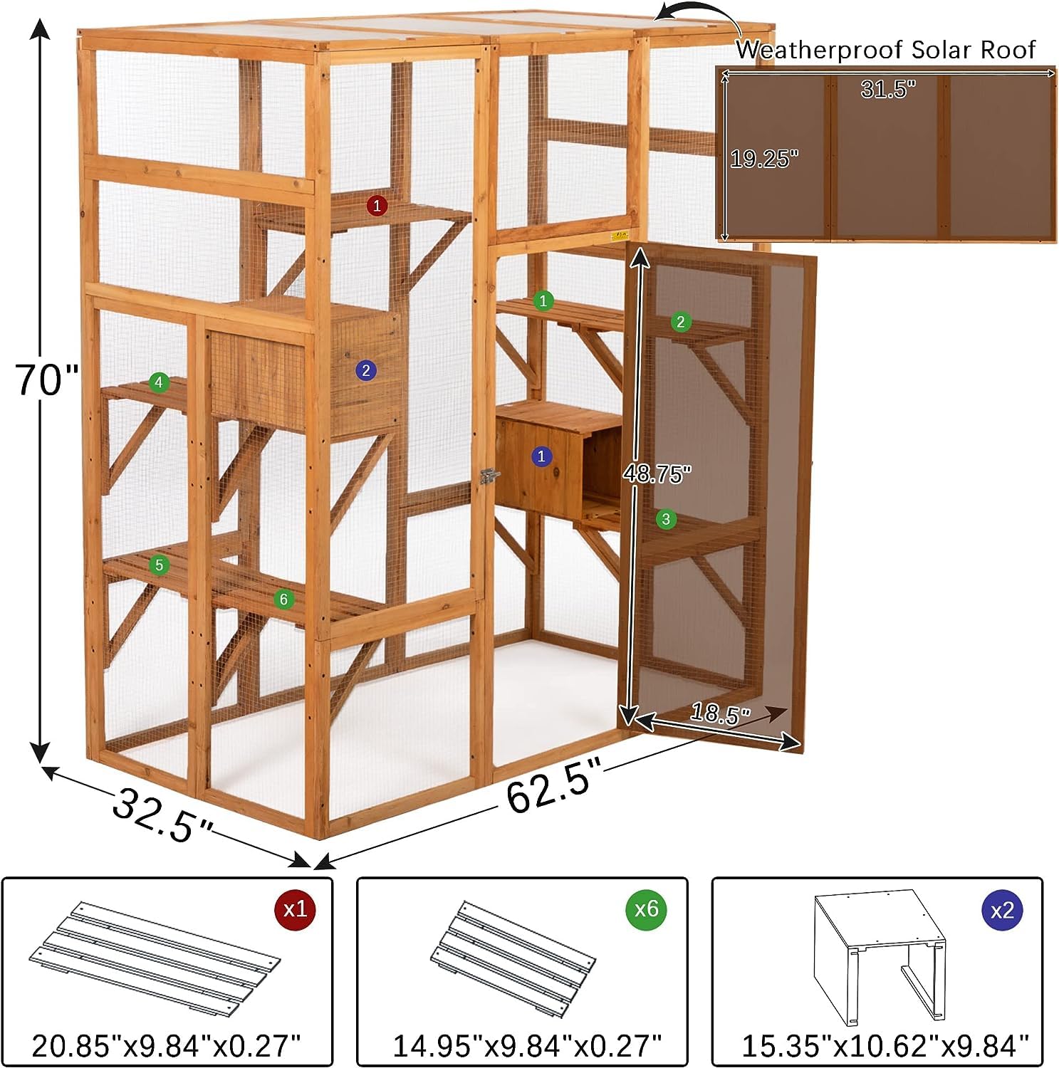 COZIWOW Large Wooden Cat Cage with Perches and Condos, Play & Run Enclosures Indoor Kitty Window Kennel with Waterproof Roof, 7 Platforms & 2 Resting Box, UV Resistant, 62.4"L x 32.4"W x 70"H, Orange