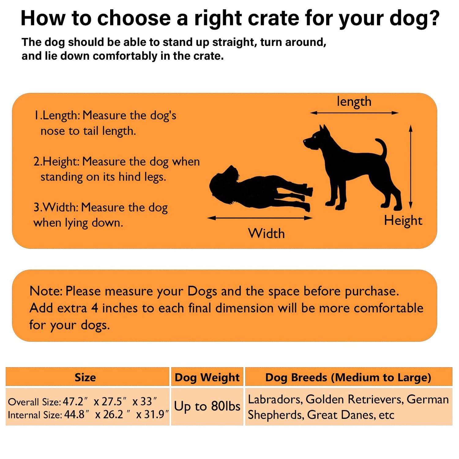 - 【Spacious Interior】 Overall dimensions is 47.2"W x 27.5"D x 33"H. This large dog crate offers ample room for large breeds to stand, turn around, and lie down comfortably. Note: Measure your dog and the space where the dog cage is to locate before purchasing.