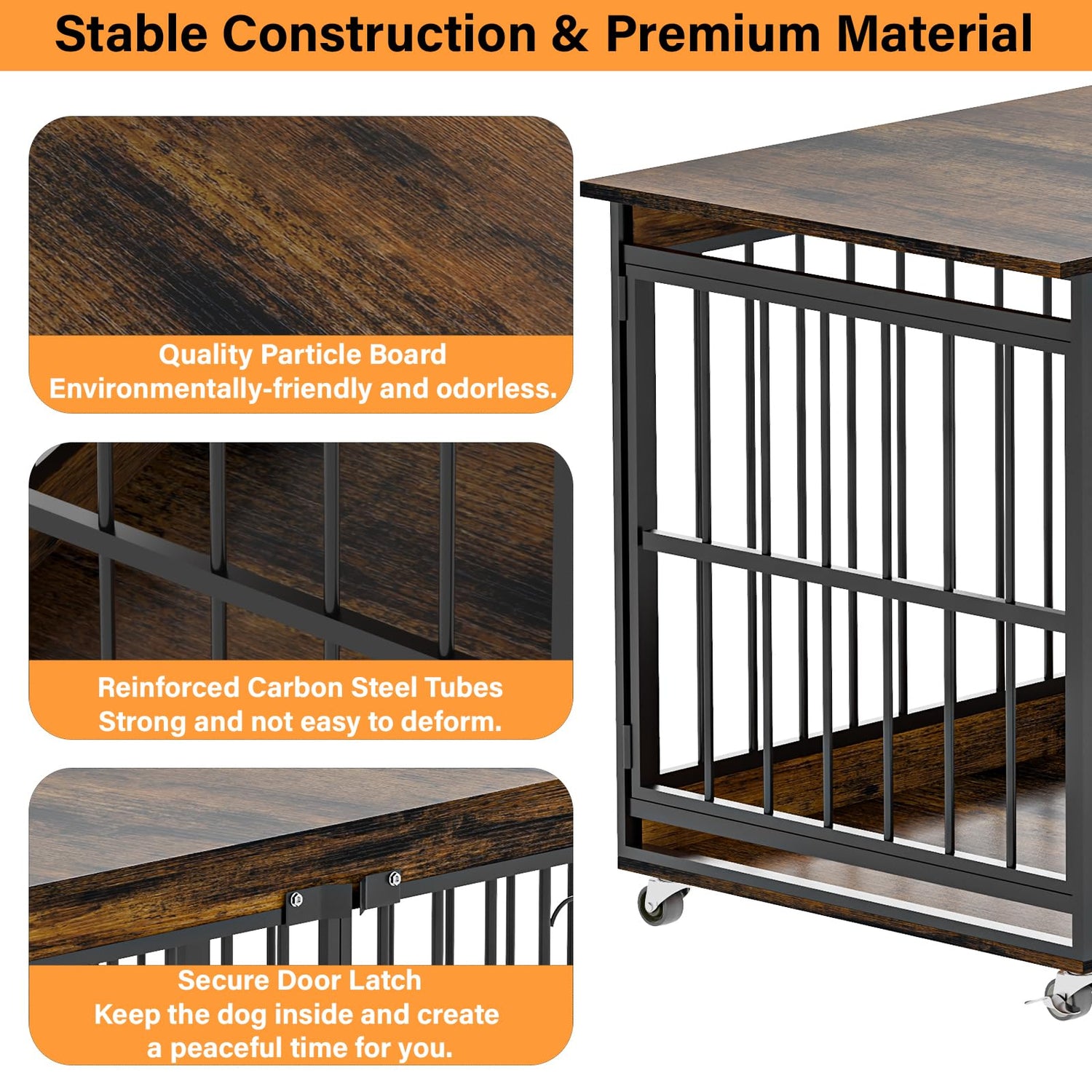 - 【Sturdy Frame】This xl dog crate is crafted from high-quality particle board with a beautiful retro wood finish and sturdy metal bars, which ensures its safety and durability. The combination of wood and metal adds a touch of sophistication to your home.