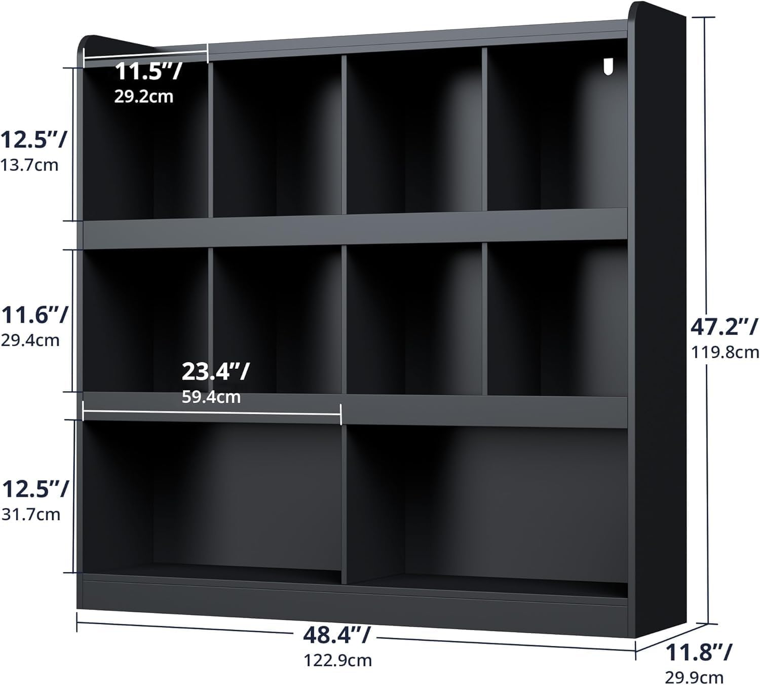 Cozy Castle 10 Cube Bookcase, 3 Tier 47.2'' Bookshelf, Kids Bookshelf Organizer, Wooden Bookcase with Anti-Tilt Device, Modern Storage Display Cabinet for Study Room, Bedroom, Living Room,Black