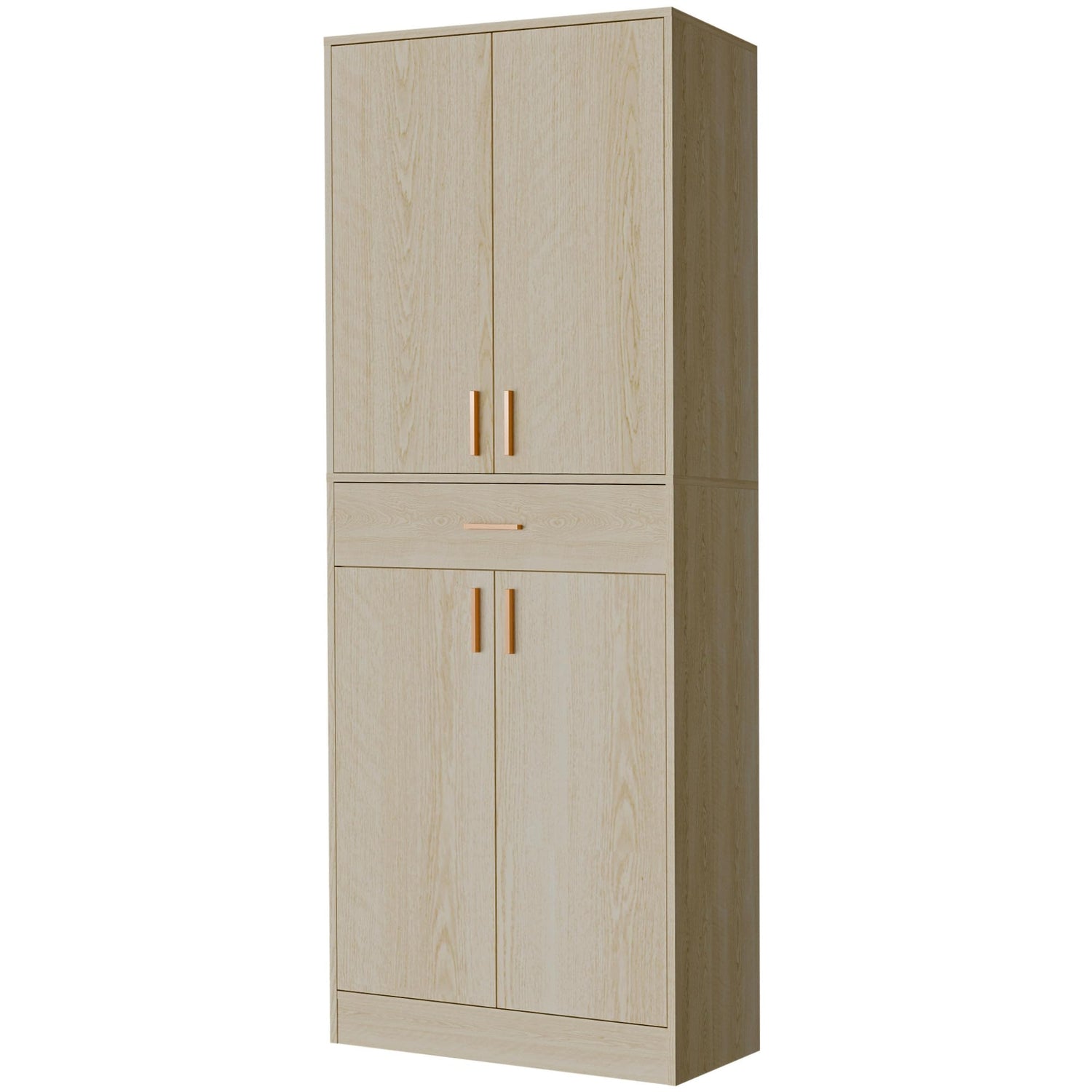 Cozy Castle Tall Oak Pantry Storage Cabinet with 4 Doors, Sliding Drawer, and Adjustable Shelves