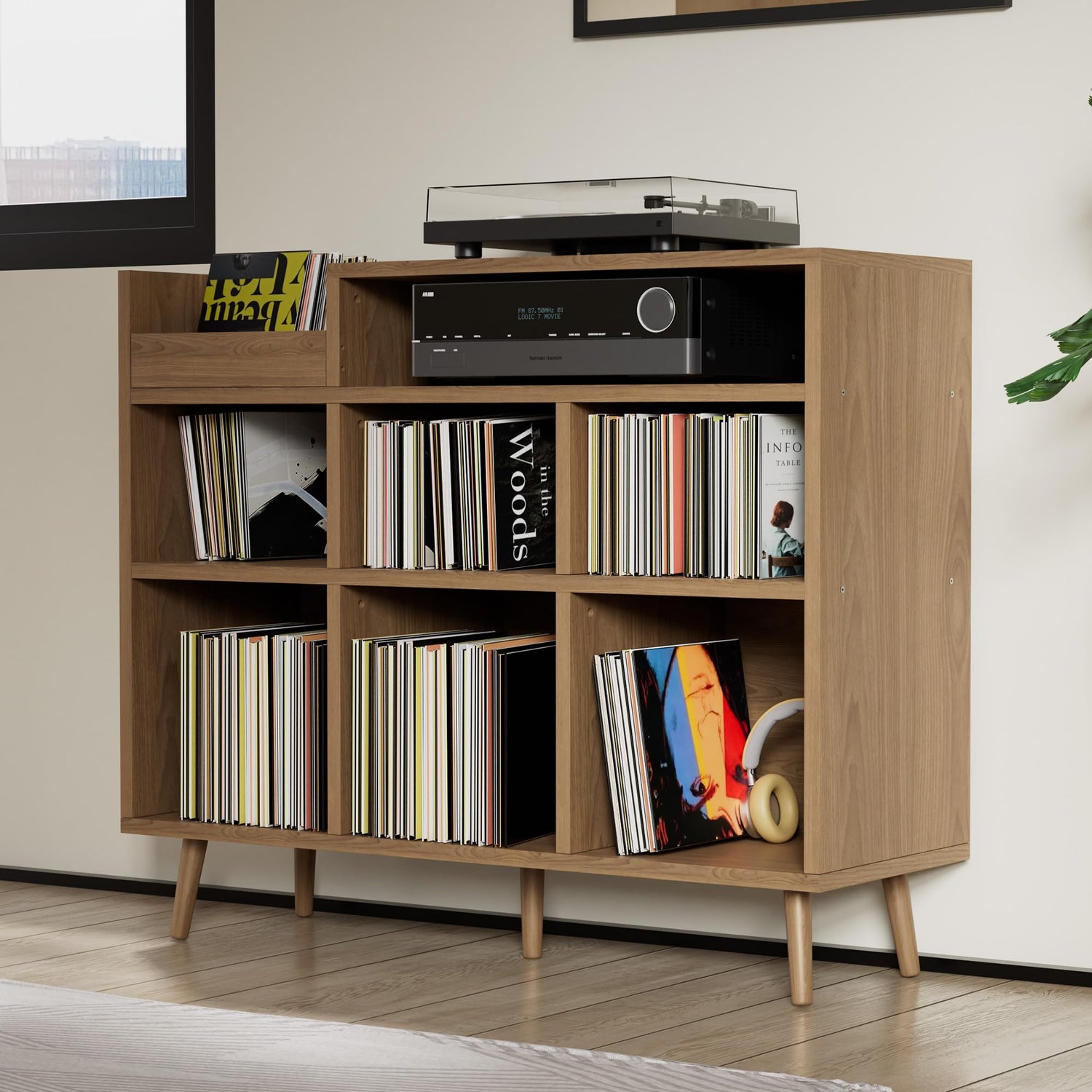 - Wood Turntable Shelf: The vinyl record player shelf has a total of 8 open compartments for storage 7" and 12" vinyl records. Can hold about 500 vinyl records (storage format: vertical and horizontal). The spacious design can meet your different storage needs. Also a good choice for bookcases, filing cabinets, coffee bar cabinets, etc