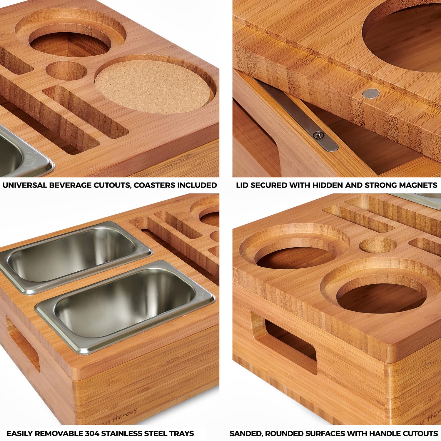 • 🥇HIGH FOOD GRADE 304 STAINLESS STEEL TRAYS - Our couch drink caddy only use premium 304 grade stainless steel food trays to make the snack trays more rust resistant and suitable as food containers.