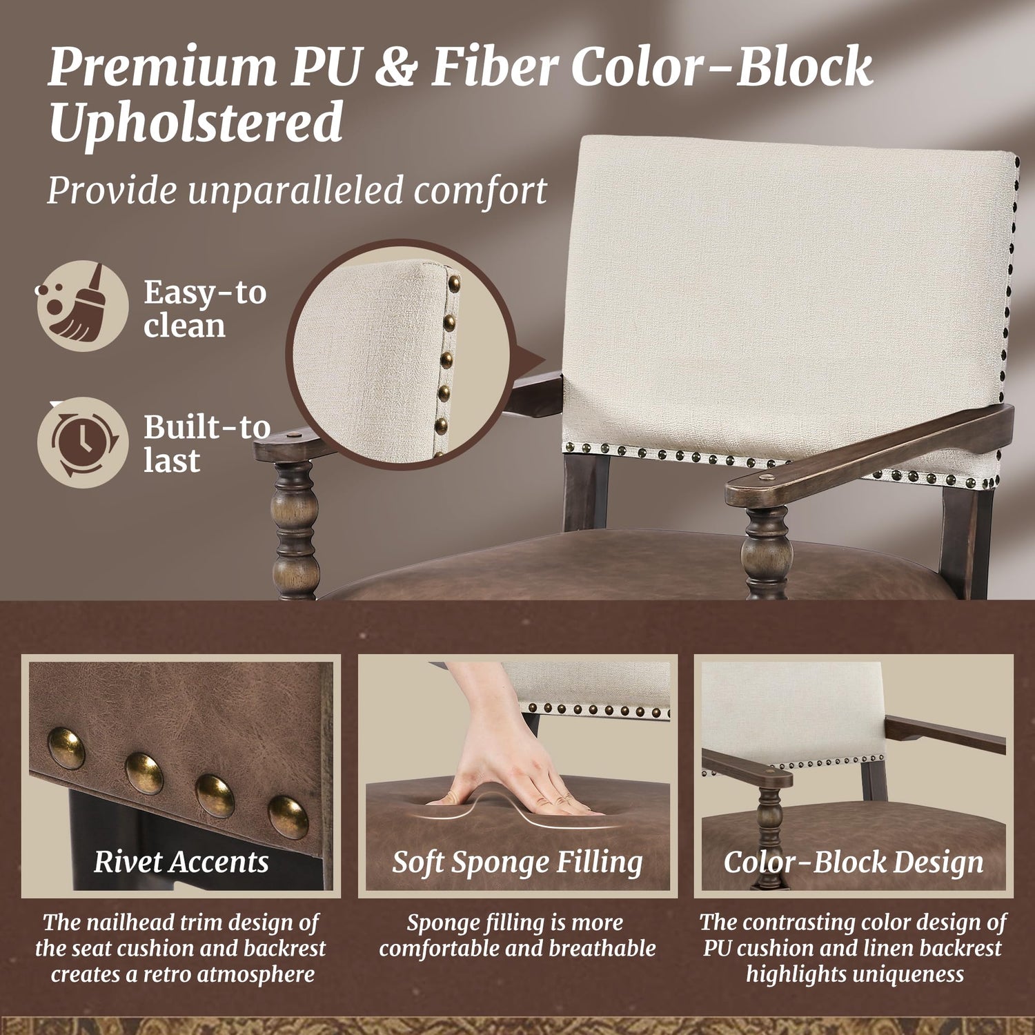 - Combining Uniqueness and Functionality: The contrasting design of the linen backrest and PU seat creates a strong visual contrast, accented with studded details that showcase a unique personality and decorative appeal; the linen is comfortable and breathable, while PU is easy to maintain, fulfilling both uniqueness and functionality