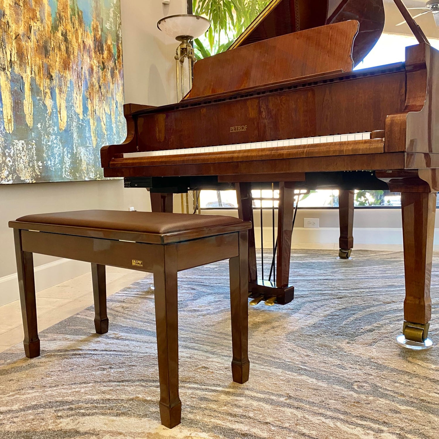 The CPS Leather Concert Grand Duet Piano Bench with Music Storage Compartment is 34" long, 14" deep and 19" high. It weighs about 21 pounds. The concert grand duet piano bench is made of solid hard wood. The seat is covered with 100% premium genuine leather with wood trim around the perimeter. The leather we use on our bench is the top quality leather you can find. It's thick and soft. Each one is hand picked by our designers to ensure the quality of the leather you expect. There is a very spacious storage compartment. Quick and easy assembly, you just attach the legs with the wrench provided. Available in walnut (brown) with high gloss finish. This product carries a one-year limited warranty against defects in materials and workmanship.