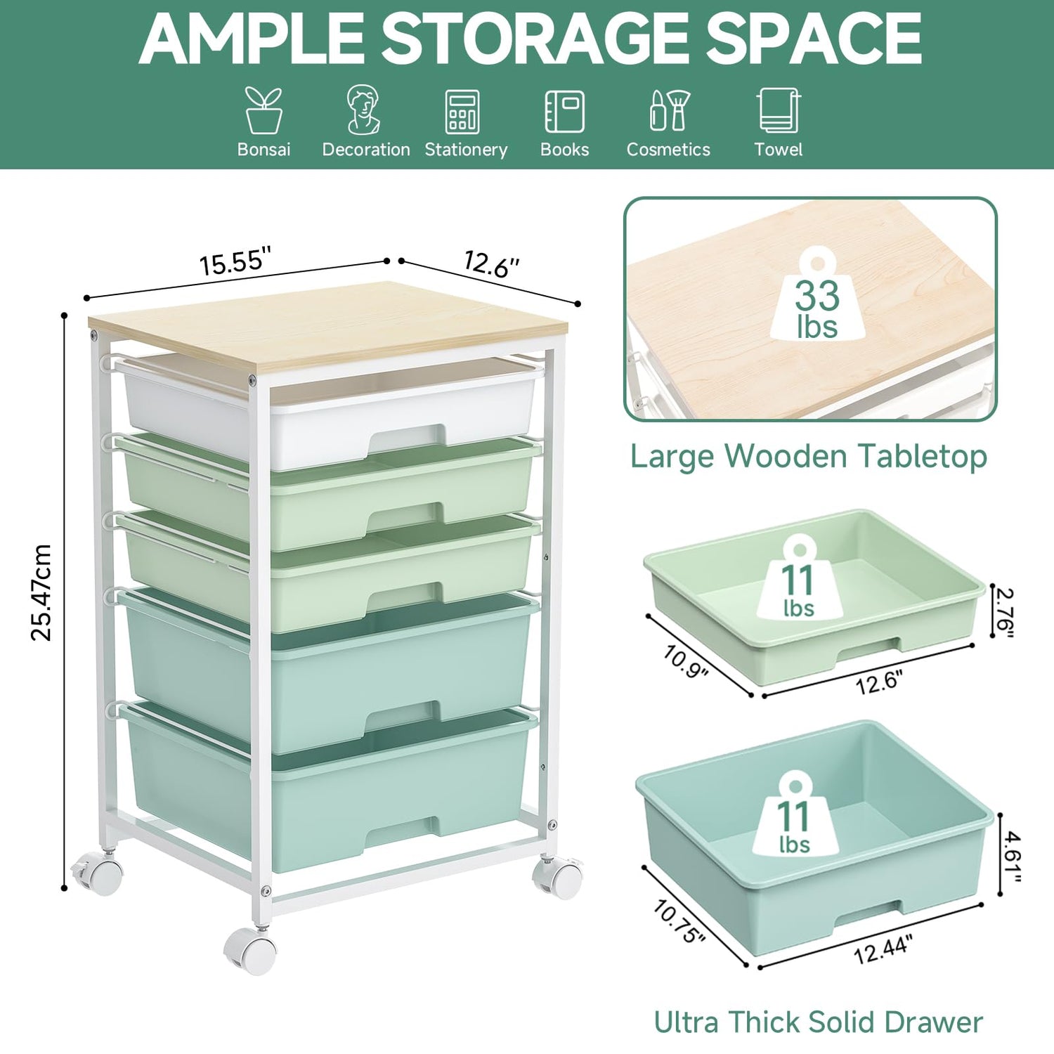 Craft cart,Rolling Cart with Drawers,Storage Cart with 5 Drawers and Wooden Tabletop for Under Desk Organizers and Storage,Green