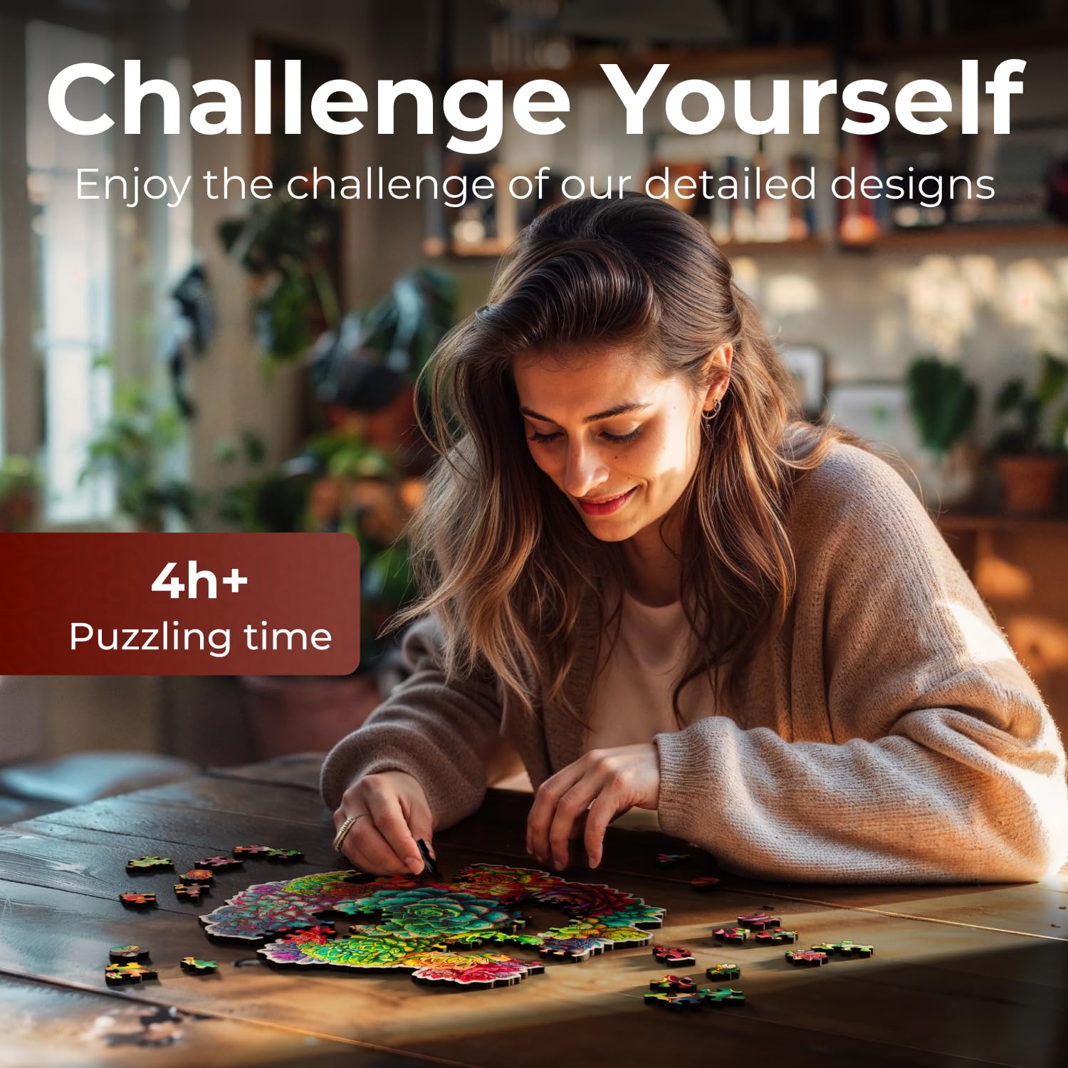 - RELAXING & CHALLENGING: Whether you're seeking stress relief or a mind challenge, this wooden jigsaw puzzle helps boost mental focus and calmness.