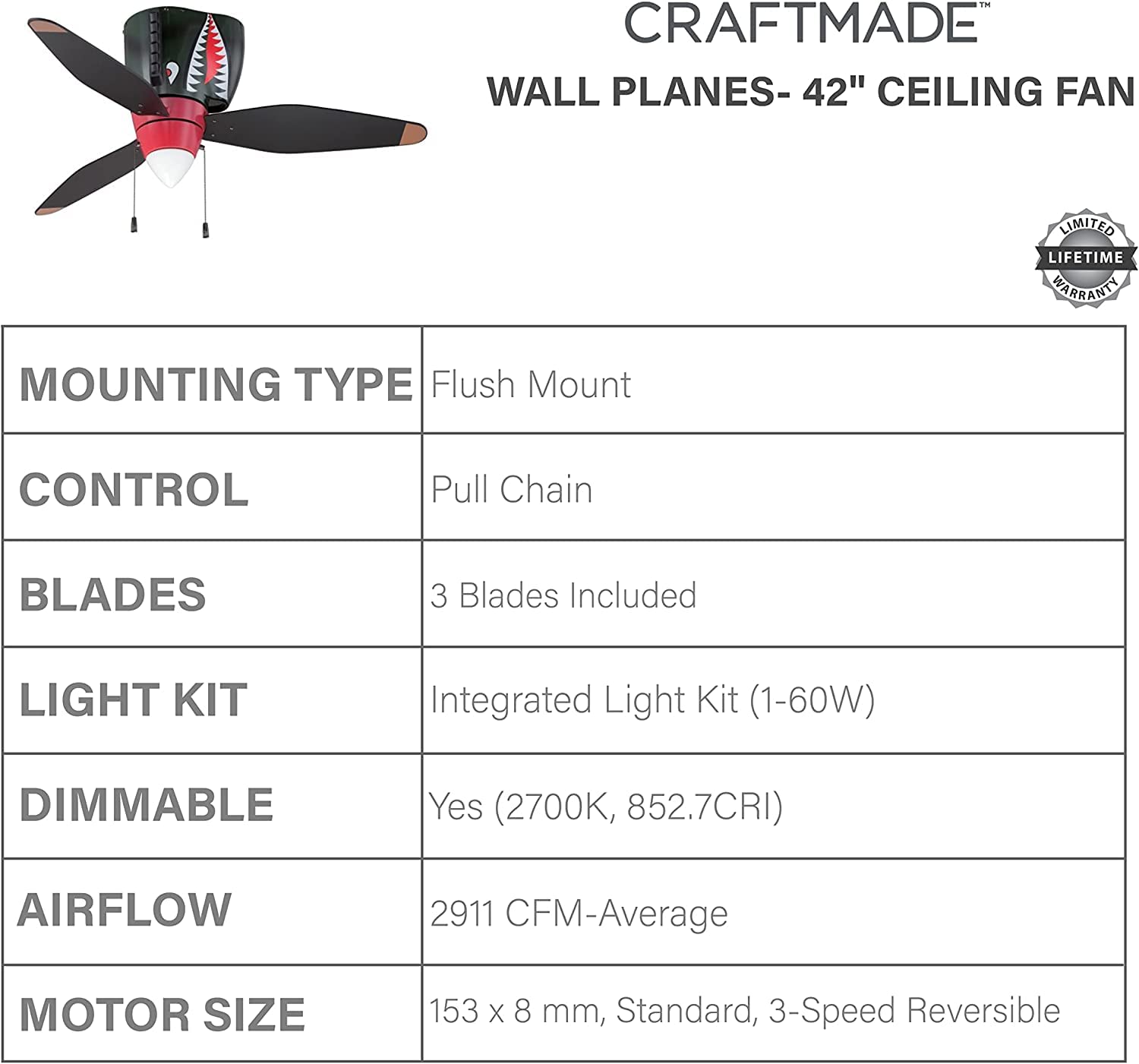 Craftmade Kids Ceiling Fan Boys WB348TS Tiger Shark Warplane With Light, 48-Inch 3 Blade Hugger Ceiling Fan