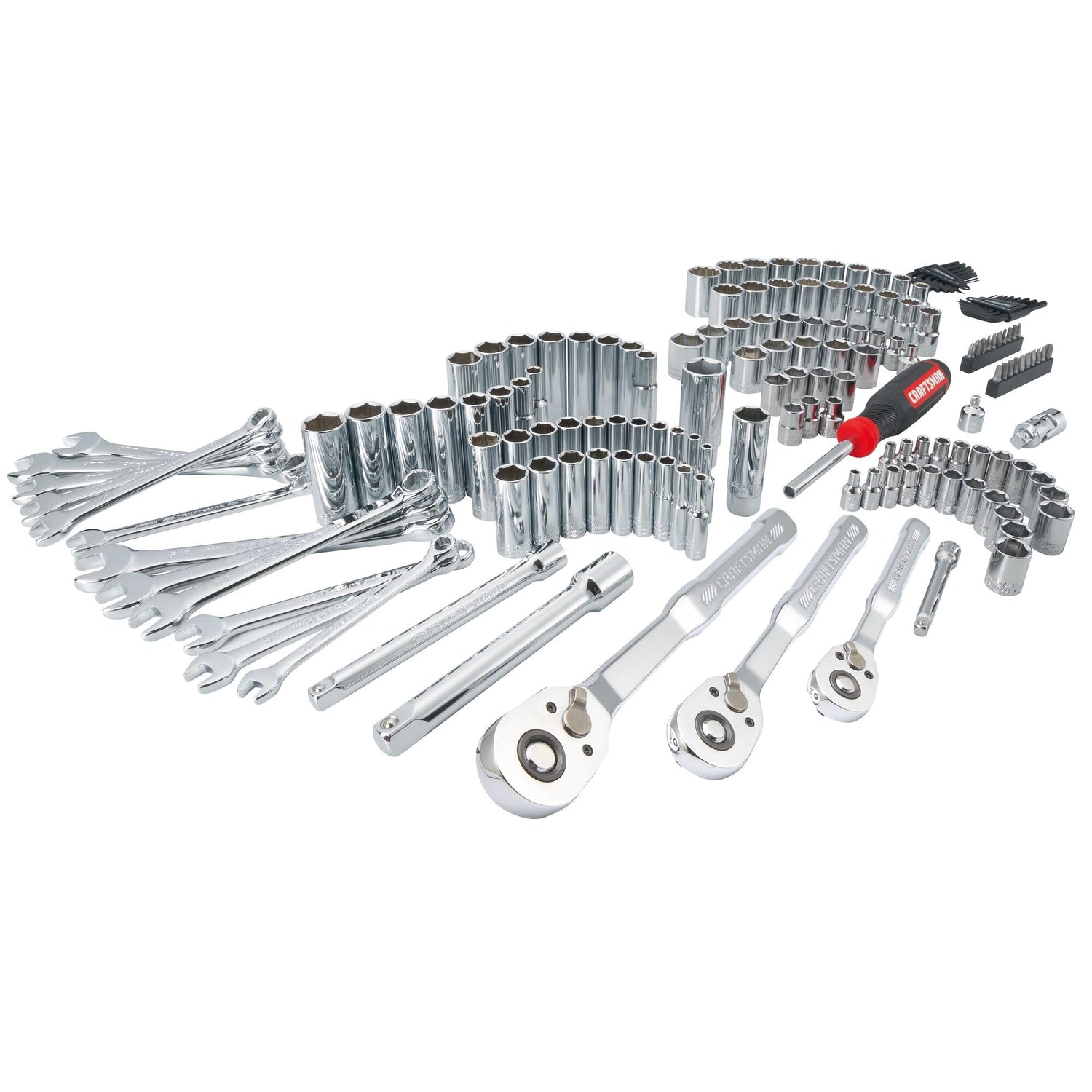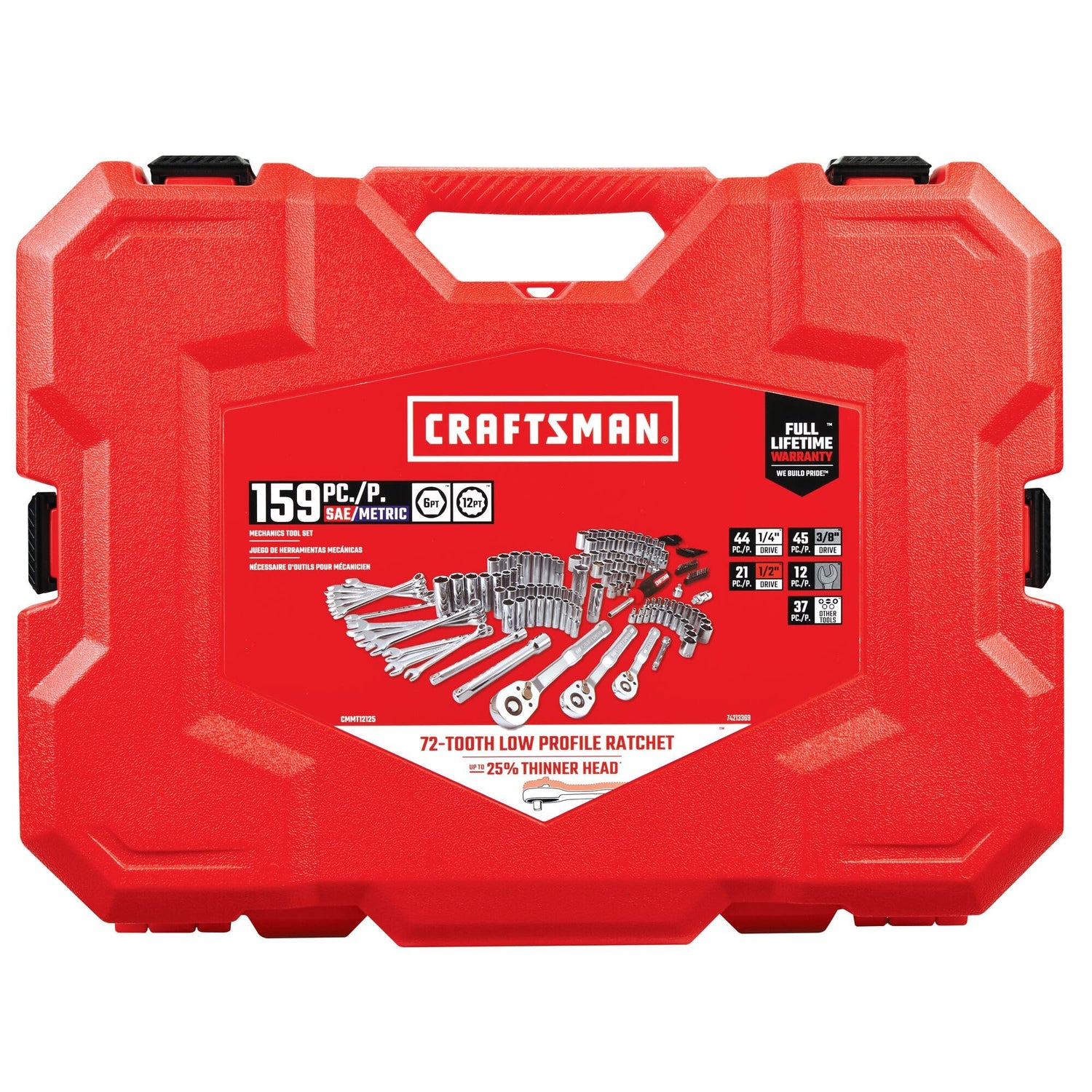 Details: The 159 pc. 1/4-in., 3/8-in., and 1/2-in. Drive Mechanics Tool Set is equipped with low profile 72-tooth ratchets with 5° arc swing and up to a 25% thinner head* that helps deliver greater access in confined spaces. Packed with a broad assortment of 6-point and 12-point sockets, combination wrenches, and drive tools in a durable blow mold case. The case is constructed with metal hinges and designed to fit into CRAFTSMAN metal storage boxes for easy organization. Perfect as an addition to your current tool collection or as a starter set. Proudly backed by a Full Lifetime Warranty. *1/4 in. DR and 3/8 in. DR Only As Compared To CMMT81747, CMMT81748, & CMMT81749