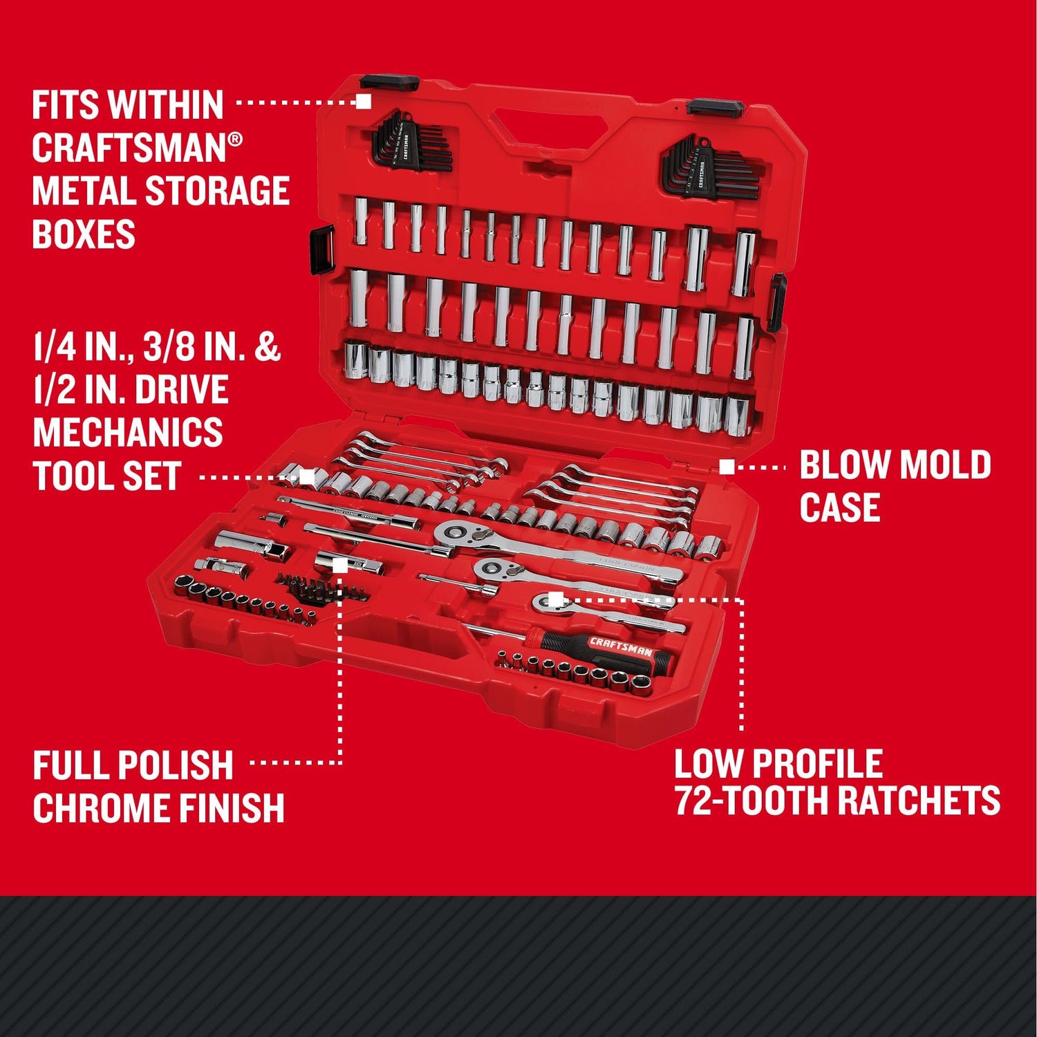 Details: The 135 pc. 1/4-in., 3/8-in., and 1/2-in. Drive Mechanics Tool Set is equipped with improved low profile 72-tooth ratchets with 5° arc swing and up to a 25% thinner head* that helps deliver greater access in confined spaces. Packed with a broad assortment of 6-point and 12-point sockets, combination wrenches, and drive tools in a durable blow mold case. The case is constructed with metal hinges and designed to fit into CRAFTSMAN metal storage boxes for easy organization. Perfect as an addition to your current tool collection or as a starter set. Proudly backed by a Full Lifetime Warranty. *1/4” DR and 3/8” DR Only As Compared To CMMT81747, CMMT81748, & CMMT81749