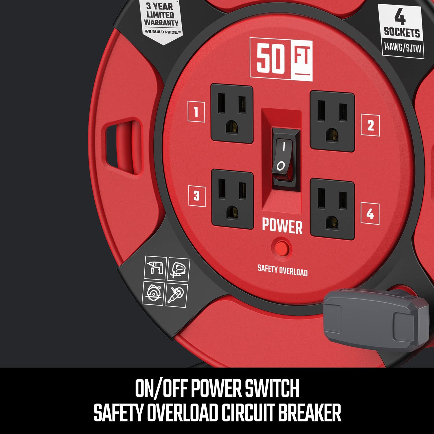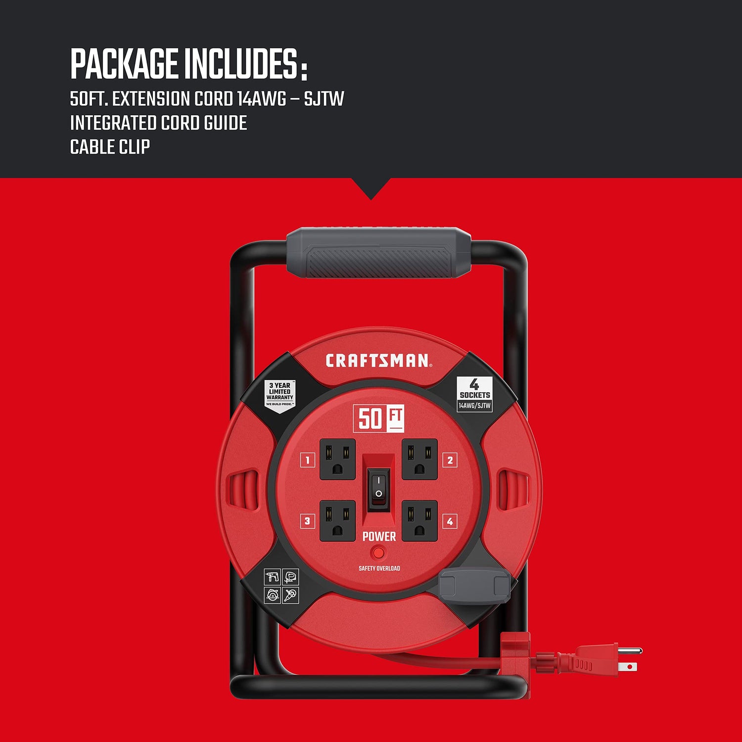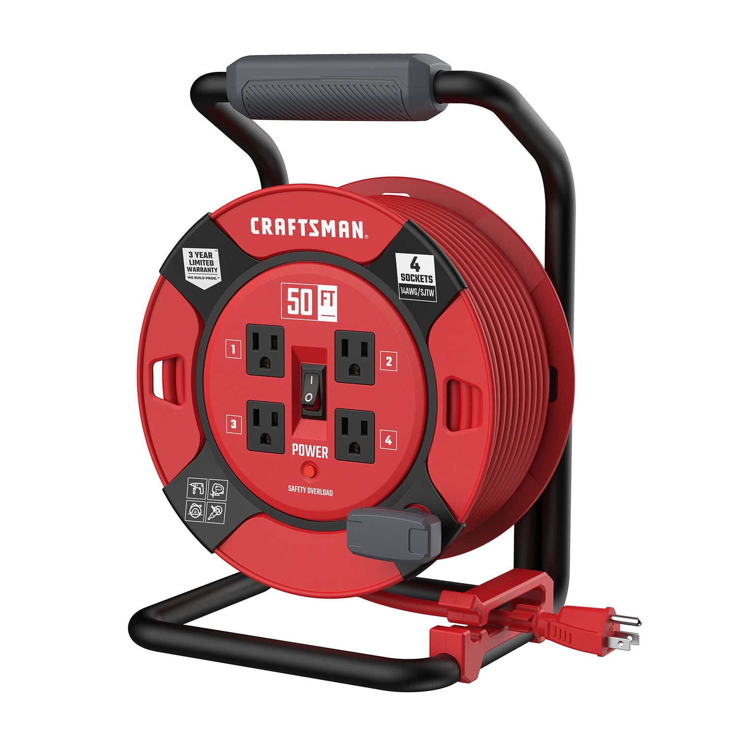 - Power Where You Need It: Make sure you have plenty of outlets while working outside with this Extension Cord Reel with 4 outlets CRAFTSMAN! This 50 ft electric extension cord is CSA certified and has an On/Off switch and light indicator.