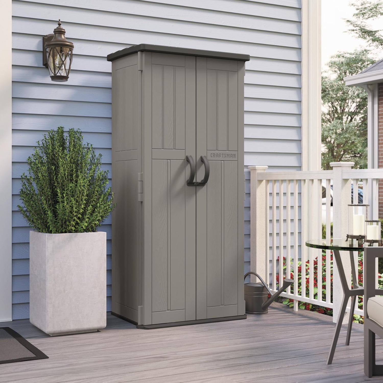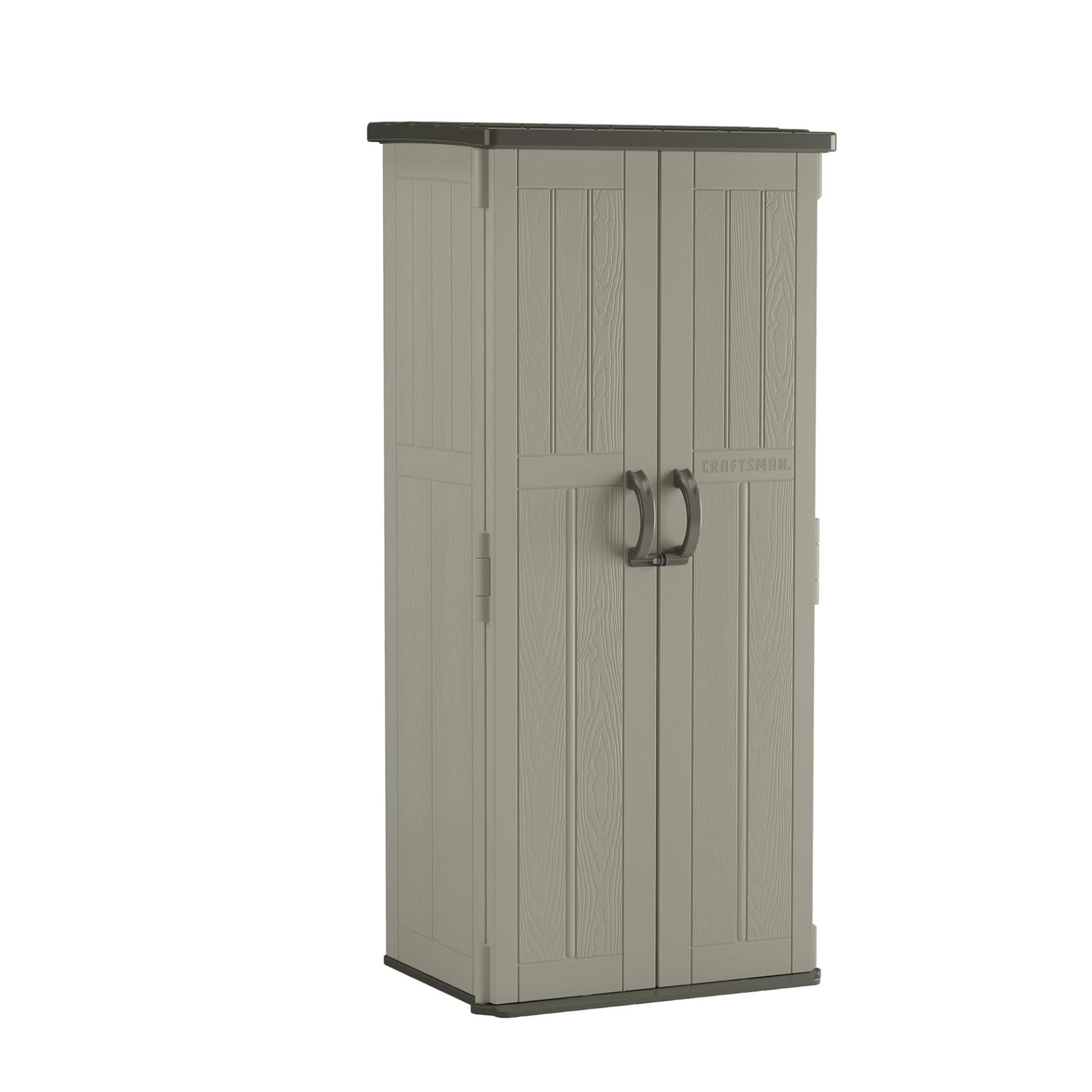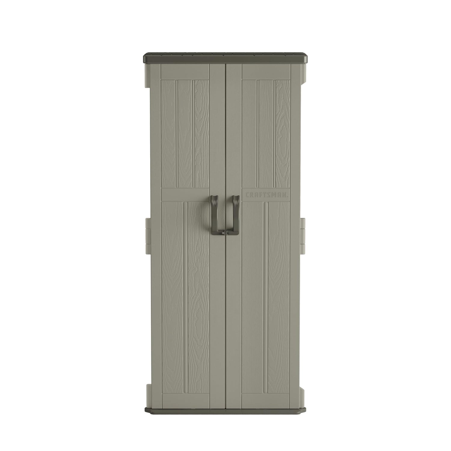 Details: Great for organizing tools, gardening gear, ladders, and more, this Vertical Storage Shed is the perfect choice for a small patio, porch, or balcony. With a customizable interior that can support up to four shelves (not included), this water-resistant, UV-protected shed will provide year-round organization, not to mention easy maintenance, with its durable, multi -wall resin construction.