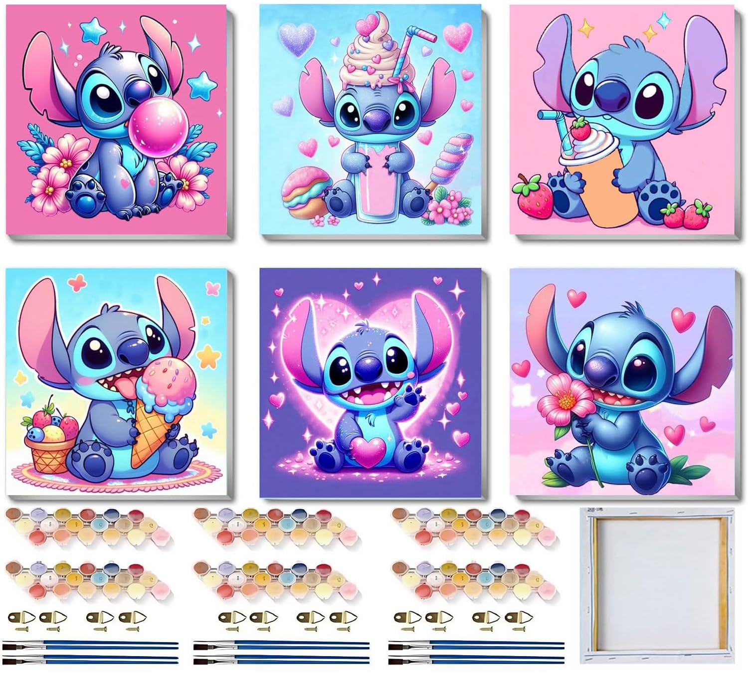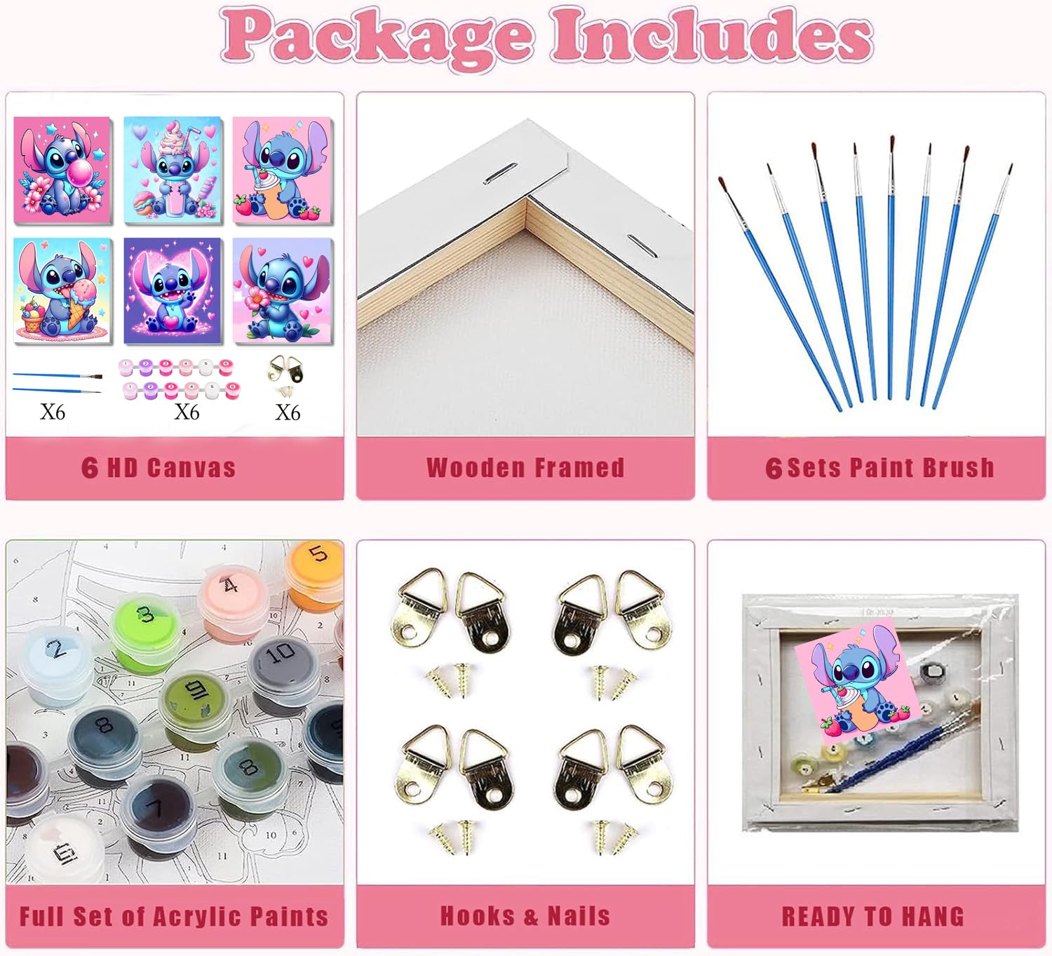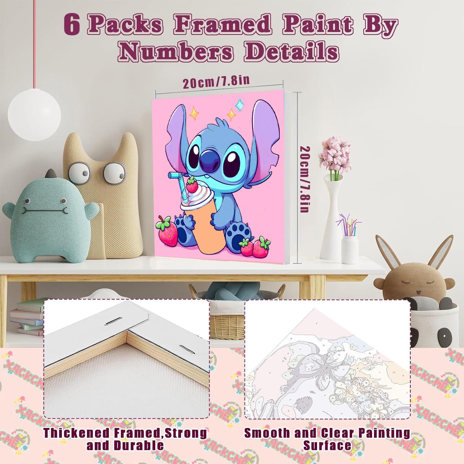 CraftyTime 6 Pack Cartoon Paint by Numbers Kits for Kids with Framed Canvas Paint by Number for Kids Ages 4-8-12, DIY Easy Acrylic Oil Painting Kits for Home Wall Decor (8X8inch)