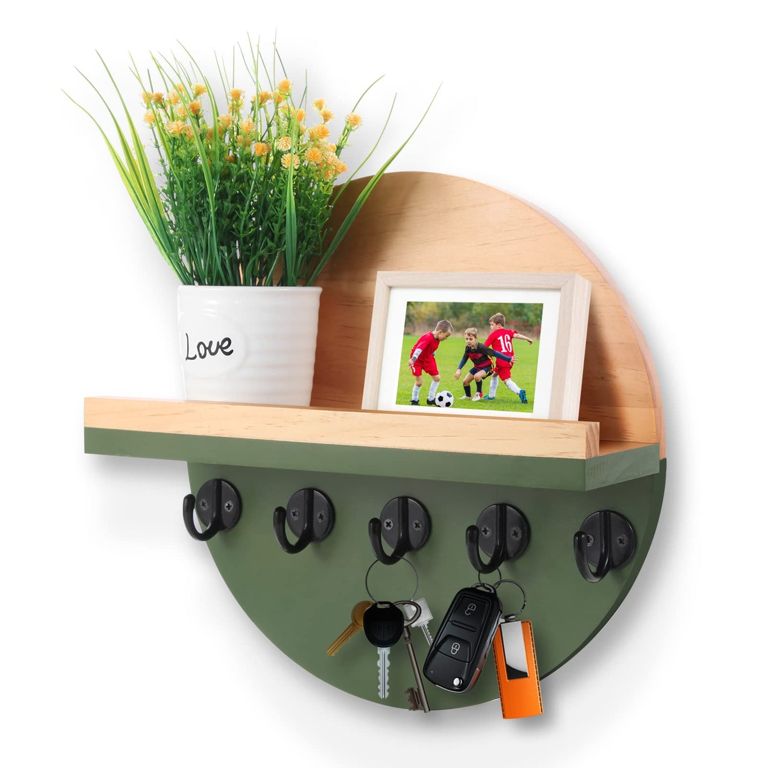 CRAKTH Key and Mail Holder for Wall Decorative, Wooden Boho Key Hanger with Shelf, Unique Two-Tone Circular Design Entryway Key Rack - Brown & Green