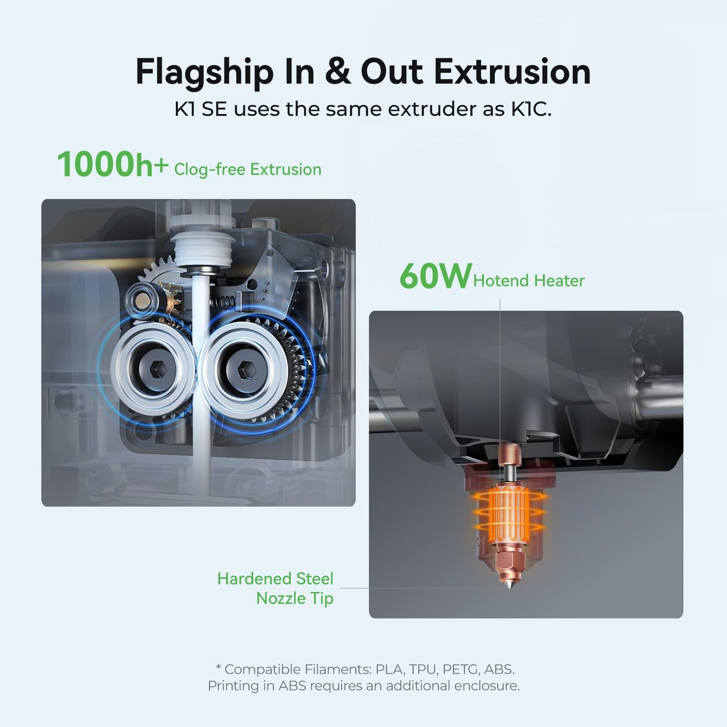 - 300°C and 1000H+ CLOG-FREE DIRECT EXTRUDER: K1 SE upgraded 3d printer has the multiple nozzle sizes (0.4, 0.6, 0.8mm) and a 300°C Dual-gear direct drive extruder, Apart from commonly seen filaments, it can also handle the flexible TPU, PLA, PETG and ABS. The ceramic heater, encircling the hotend, can fully melt ABS*, and other filaments for ultra-fast printing