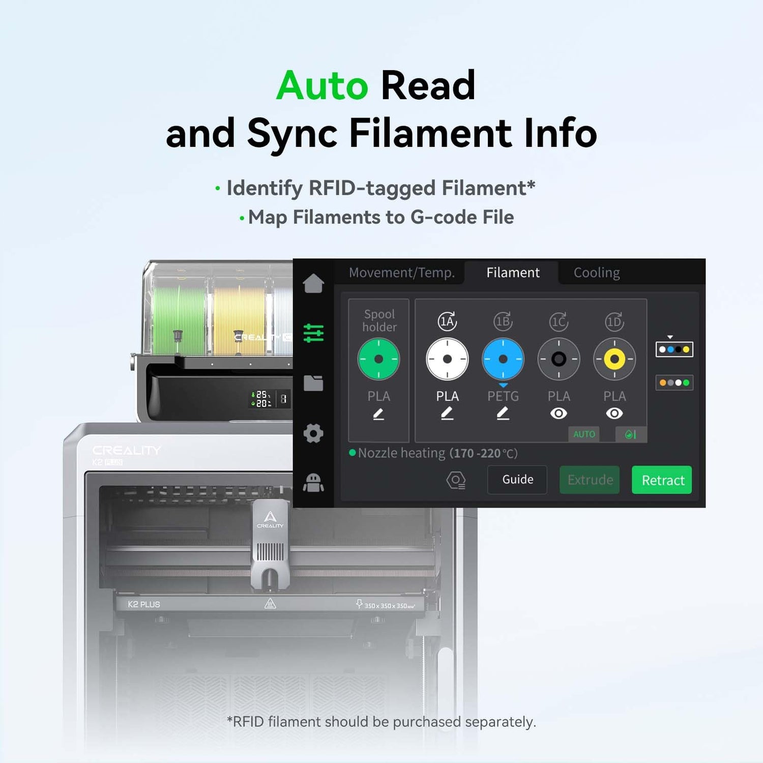 - Auto Filament Identification & Seamless Switching – RFID technology automatically detects the filament type, color, and other parameters, syncing the details to your 3D printer for precise and smooth multi-color prints. The system can also seamlessly switch to a new spool, minimizing downtime and waste