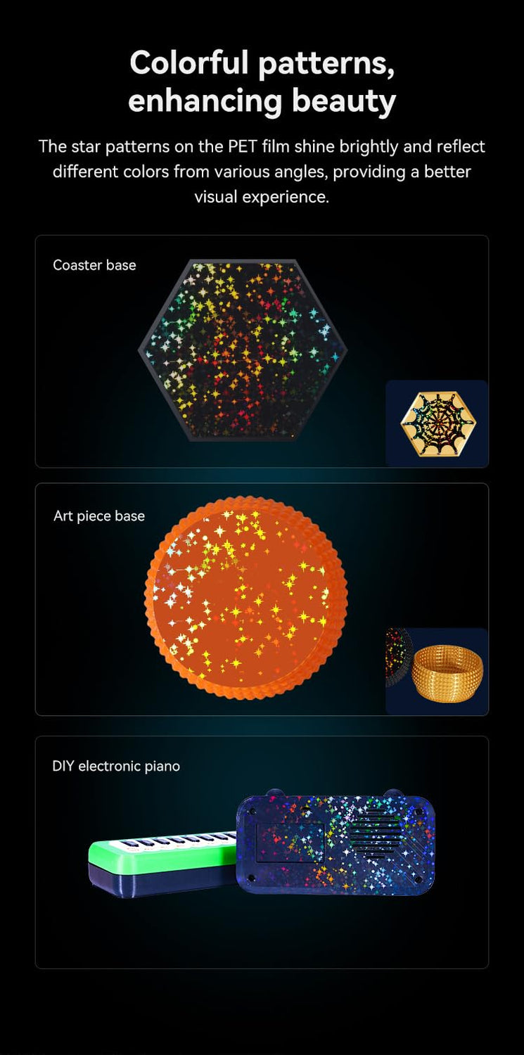 Colorful Patterns, Enhancing Beauty: The phantom patterns on the PET film shine brightly and reflect different colors from various angles, providing a better visual experience.