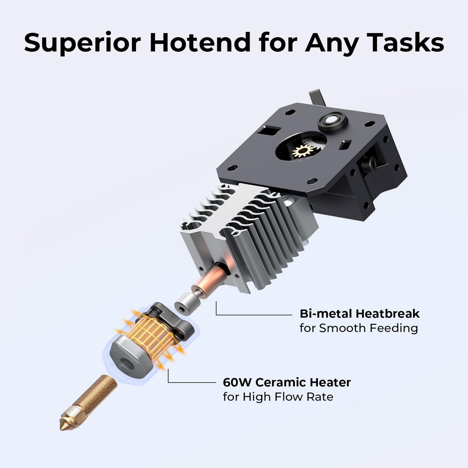 - Upgraded Extruder: The 60W ceramic heating element ensures thorough filament melting. With a copper alloy throat and nozzle, it supports printing temperatures up to 300°C, supporting various materials like PLA, PETG, ABS, TPU, PC, and ASA.