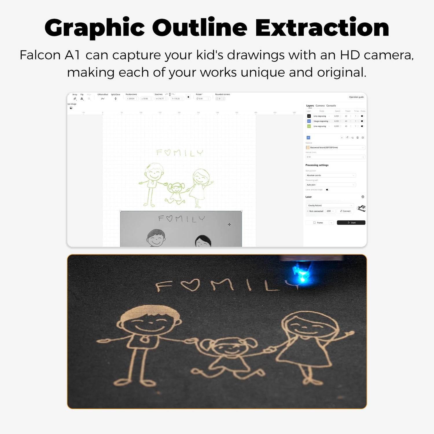 - 【3 Times Faster】Falcon A1 adopts the latest CoreXY Motion System Technology and Dual Motor Power System, which enables the machine's engraving and cutting speed to reach 600mm/s, making the efficiency three times that of traditional models.