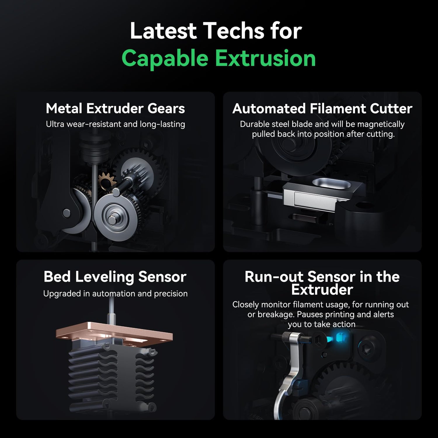 - 【Built-in RFID Reader & Auto Bed Leveling】Creality Hi has an RFID reader that, after scanning, automatically recognizes the color and filament type in use (for Creality RFID filaments only). Two independently motorized lead screws adjust the X-axis to the horizontal position.
