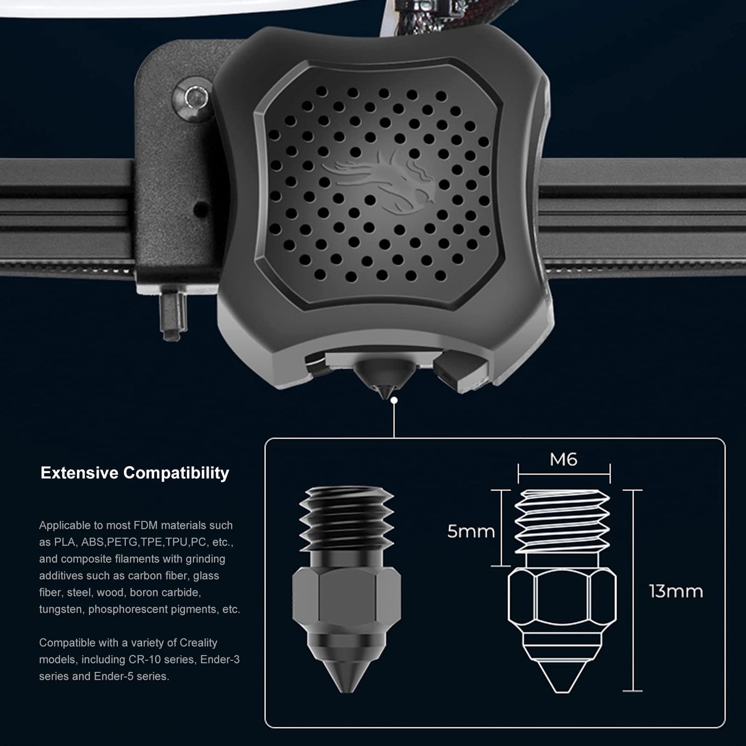 - 【Compatible with most FDM materials】 such as PLA, ABS,PETG,TPE,TPU,PC, etc., and composite filaments with grinding additives such as carbon fiber, glass fiber, steel, wood, boron carbide, tungsten, phosphorescent pigments, etc.