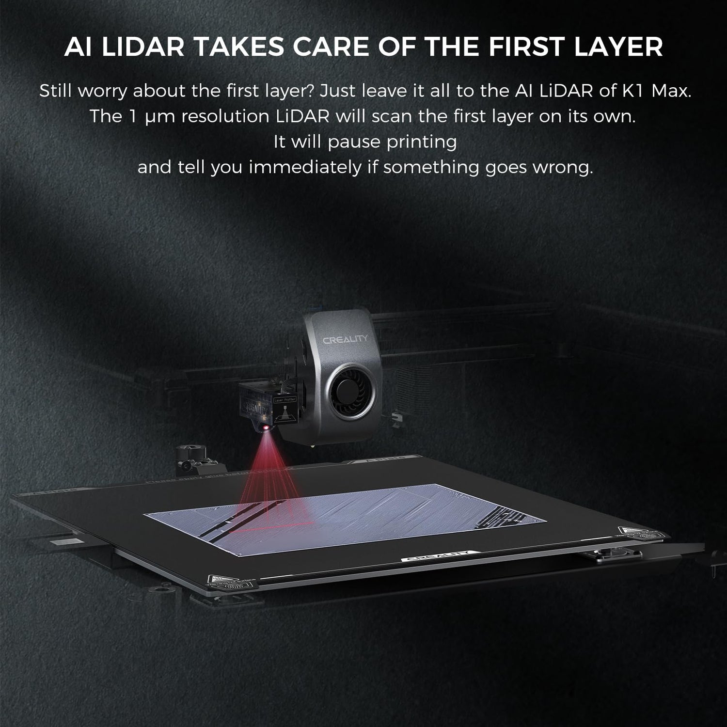 - SMART AI LIDAR AND CAMERA: The Creality K1 max all-in-one 3d printers is equipped with advanced SMART AI LIDAR and a camera system. The 1μm resolution LiDAR autonomously scans the first layer during printing, pausing the process and notifying users immediately if any issues arise. The AI camera monitors for potential problems such as spaghetti failure, foreign objects, and debris, providing real-time alerts in case of errors. Additionally, the printer supports real-time monitoring and can create time-lapses for sharing. The strain sensors in the heatbed contribute to precise leveling by generating an accurate mesh for auto compensation, ensuring optimal print quality