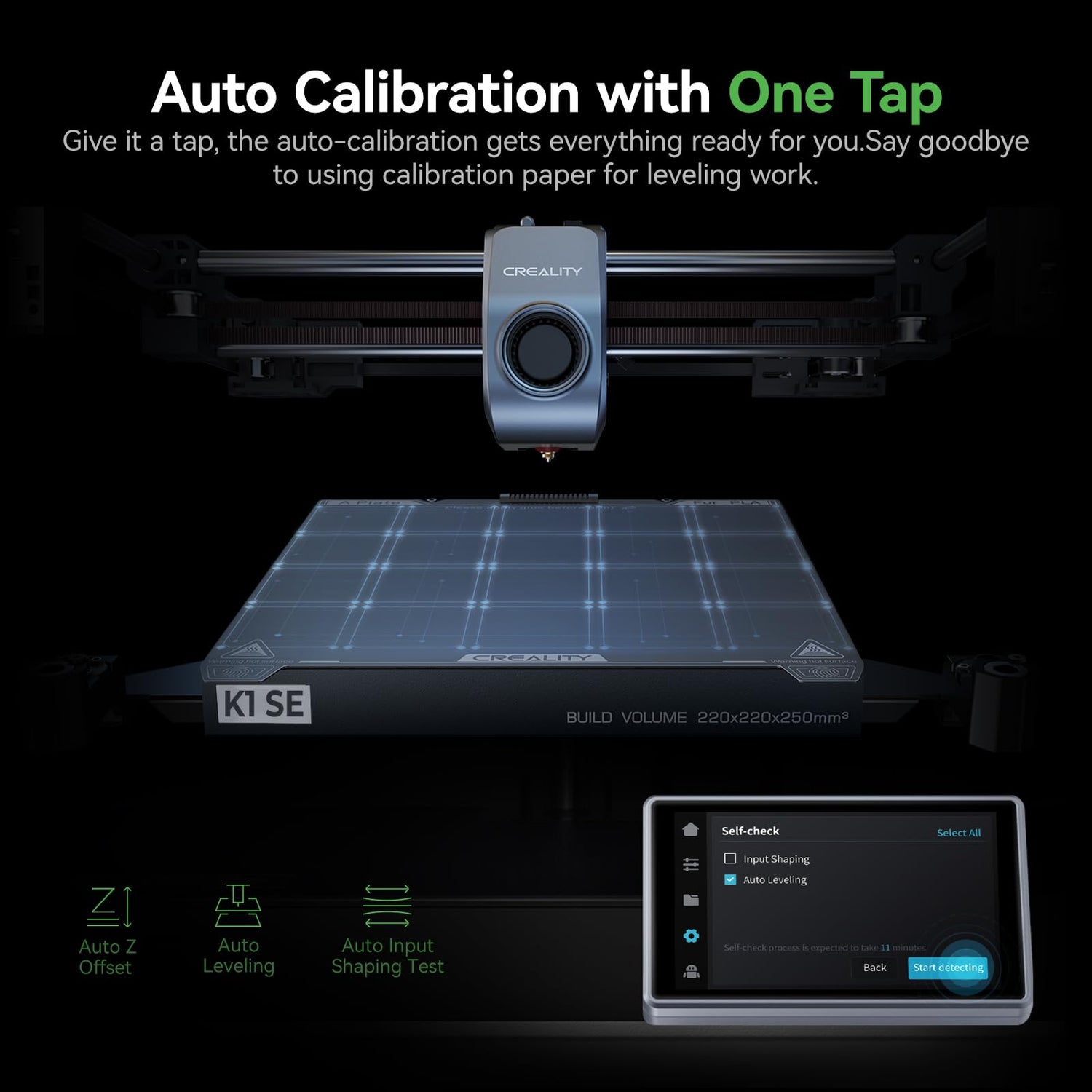 - 【Auto Calibration with One Tap】Give it a tap and walk away. The K1 SE auto-calibration gets everything ready for you. Bid farewell to the frustrating leveling work with calibration paper.