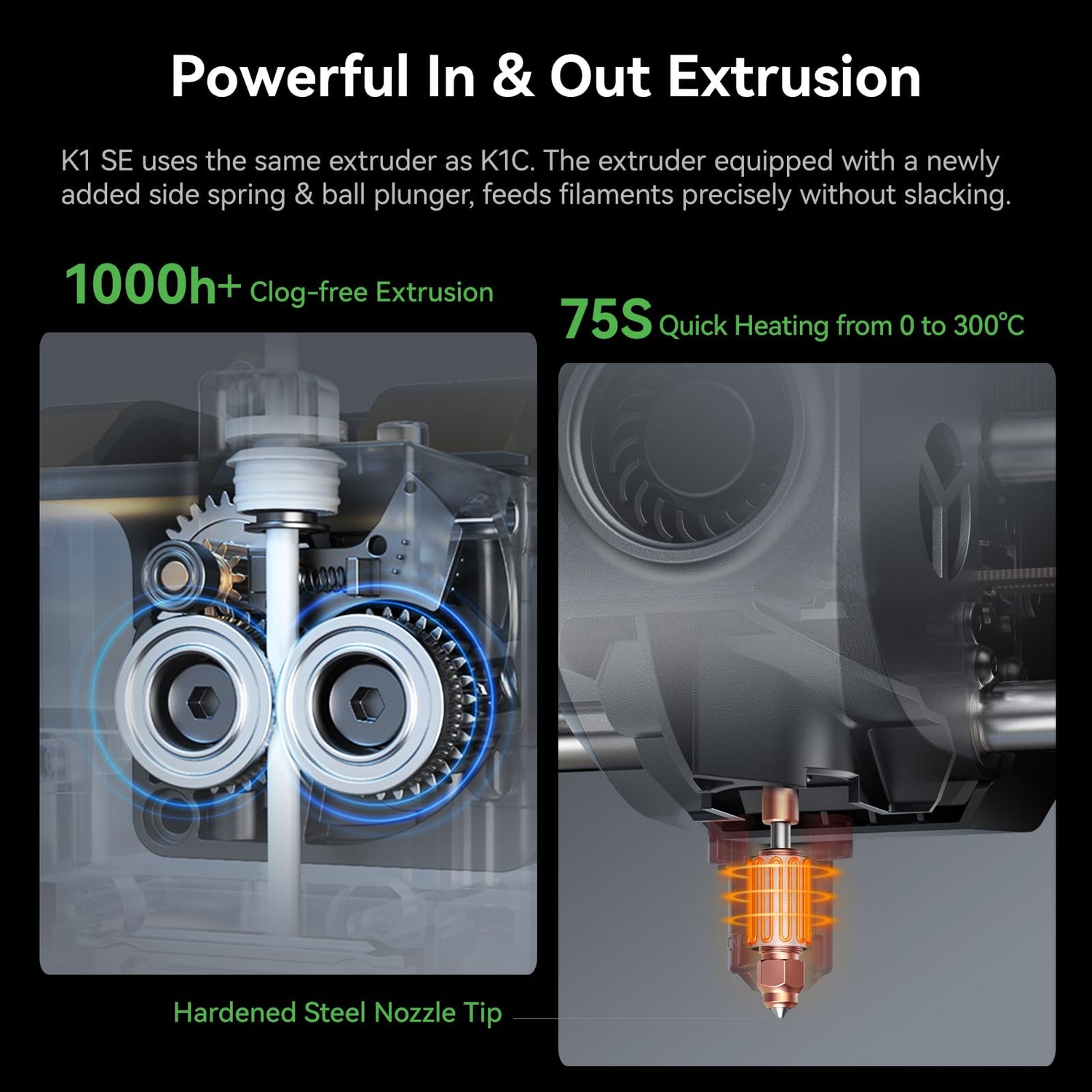 - 【Flagship Reliable Extruder】Crealitry k1 se uses the same extruder as k1c. The extruder equipped with a newly added side spring & ball plunger, feeds filaments precisely without slacking. Apart from regular filaments, it can also handle flexible TPU.