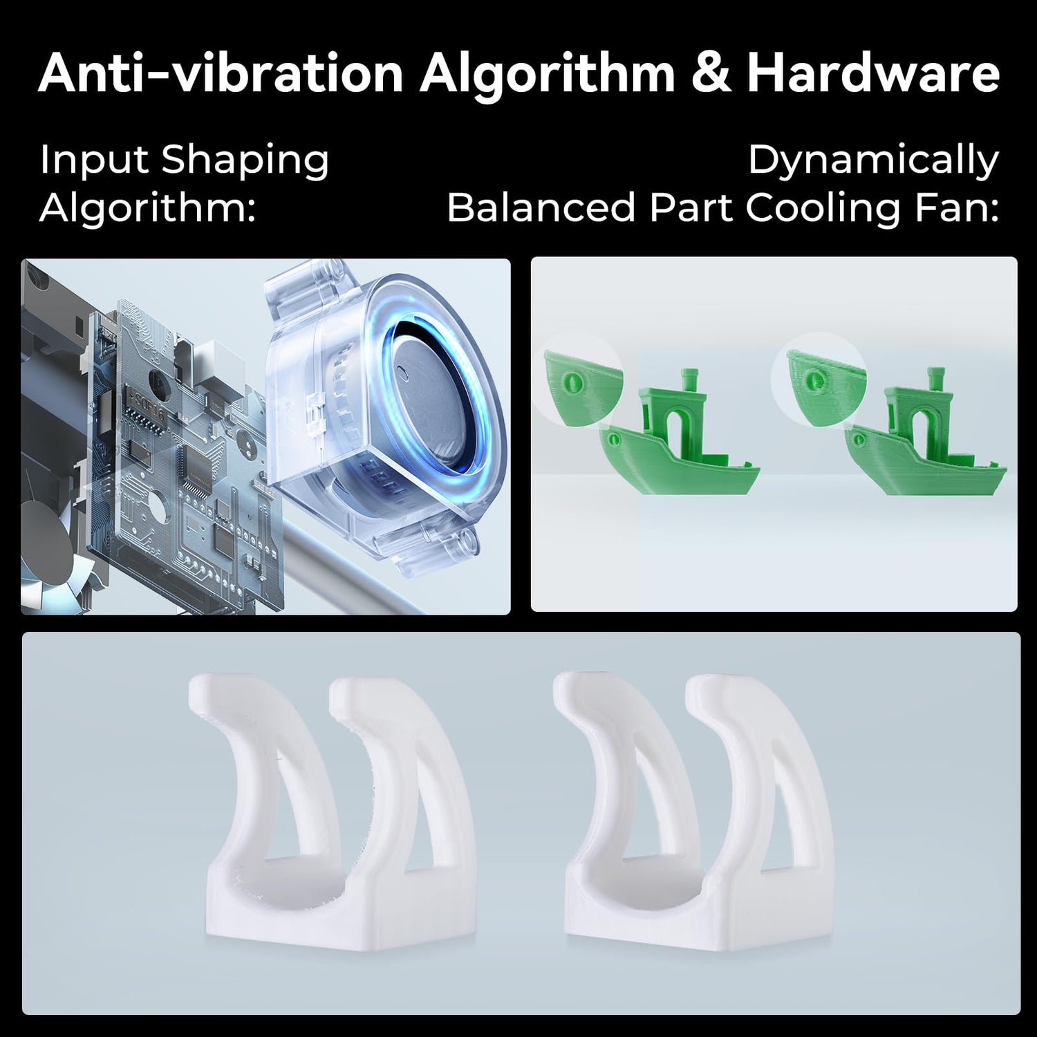- 【Anti-vibration Fan & Algorithm】A dynamically balanced part cooling fan produces fewer vibrations which are mitigated by active input shaping. No more ringing, and surface artifacts.