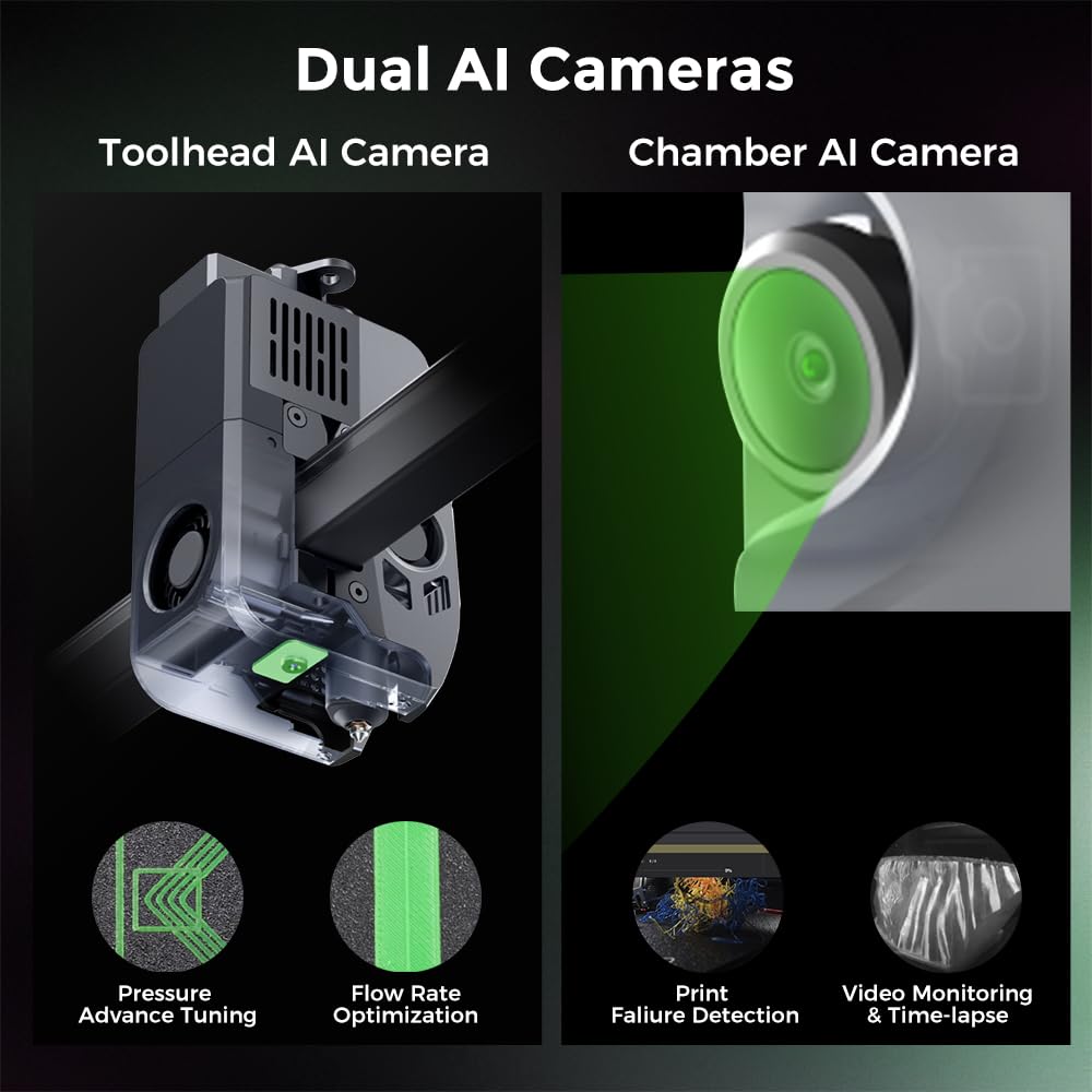 - Upgraded Function: 1.Active Belt Tensioning: On the K2 Plus, the belt tension is checked and rigged actively by a pressure sensor instead of manually. 2.Two AI Cameras: K2 Plus uses an Al camera on the chamber side to watch over spaghetti failure, foreign objects, idling, etc. It will alert you when an error occurs. lt also supports real-time monitoring and time-lapse filming. There is also an Al camera on the toolhead. lt can analyze 3d model and then generate an optimal PA value or flow rate. 3.Two Auxiliary Fans: The part cooling airflow is nearly doubled as two auxiliary cooling fans are installed on the left and right sides of the chamber