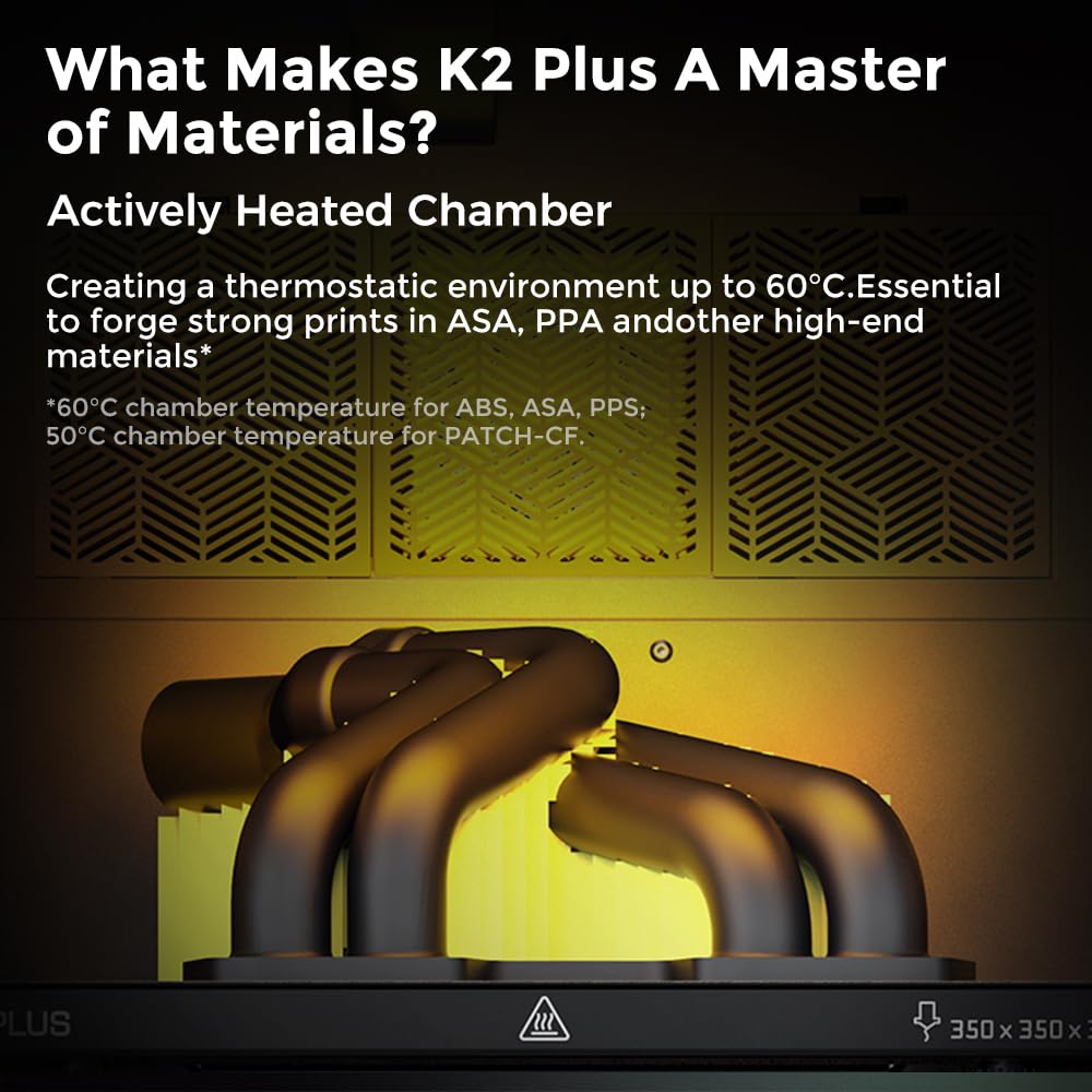 - Advanced Heating Structure: Creality K2 Plus has an actively heated chamber, which creates a thermostatic environment up to 60℃. Essential to forge strong prints in ASA, PPA and other high-end materials 60℃ chamber temperature for ABS, ASA, PPS, 50℃ chamber temperature for PATCH-CF. High-temp nozzle with hardened steel tip can reach to 350℃. Designed for use with wear-resistant engineering materials of high melting points. Supports more selection of materials, including PLA/ABS/PETG/PA-CF/PLA-CF/PET/ASA/PPA-CF