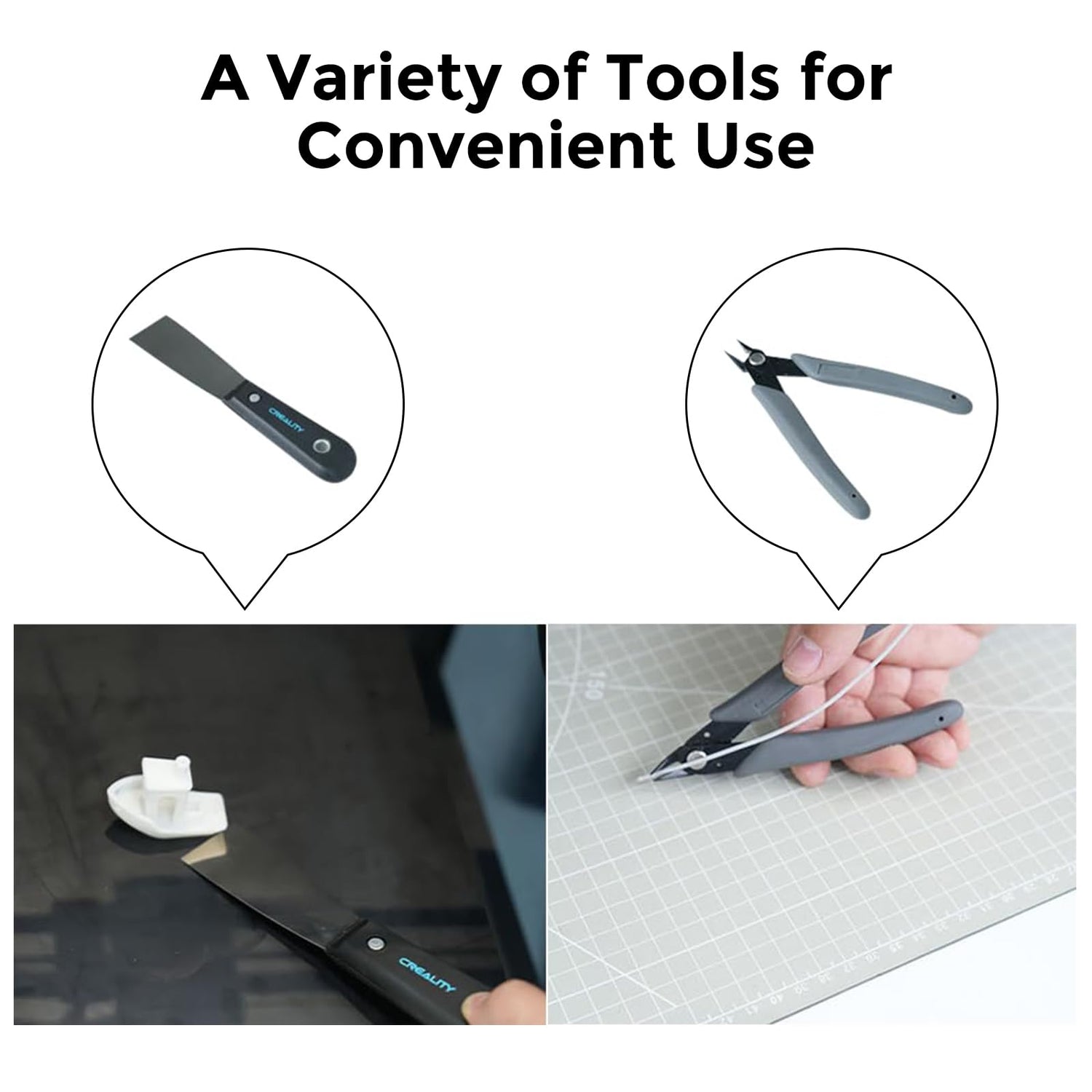 - Quality Assurance: 100% Original Creality 3D Printer Tools Kit. 74 pieces toolkit basically includes the essential tools needed in the 3D printing process, making it a preferred choice for both beginners and 3D printing professionals. Most tools are made of high-quality metal, and the handles are made of durable silicone and plastic. The entire set of tools is robust and flexible, not easy to break and trust, allowing you to use for a long time.