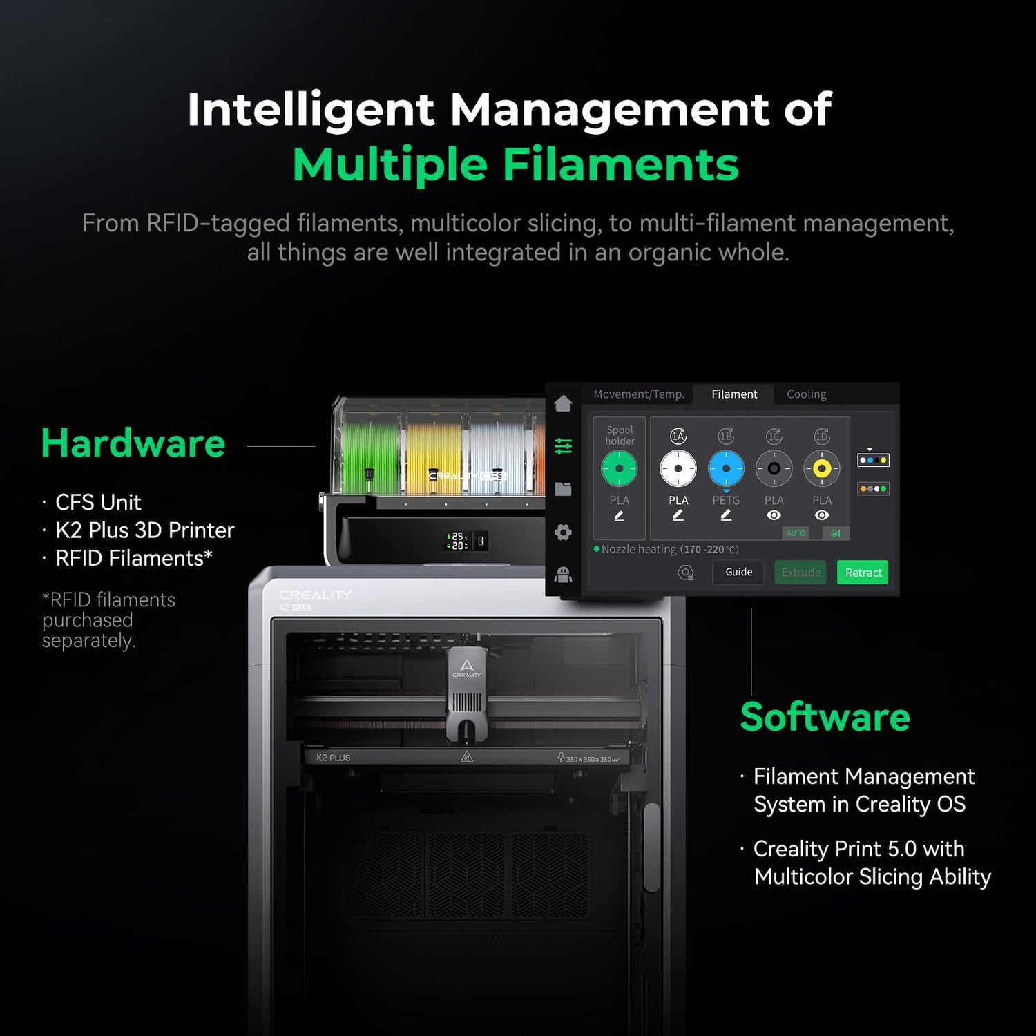 - 【Multi Color Printing with All-new CFS】One CFS can house four filament spools. With four CFS units hooked together, it is possible to deliver 16-color 3D prints, saving the need for painting afterward. By creating snap-away or water-soluble supports, the post-processing becomes a breeze. CFS is intelligent with automatic filament selection, switch, and relay. Upon loading an RFID filament, it can read the color and type instantly. When a filament is running out, it can relay with a similar one installed
