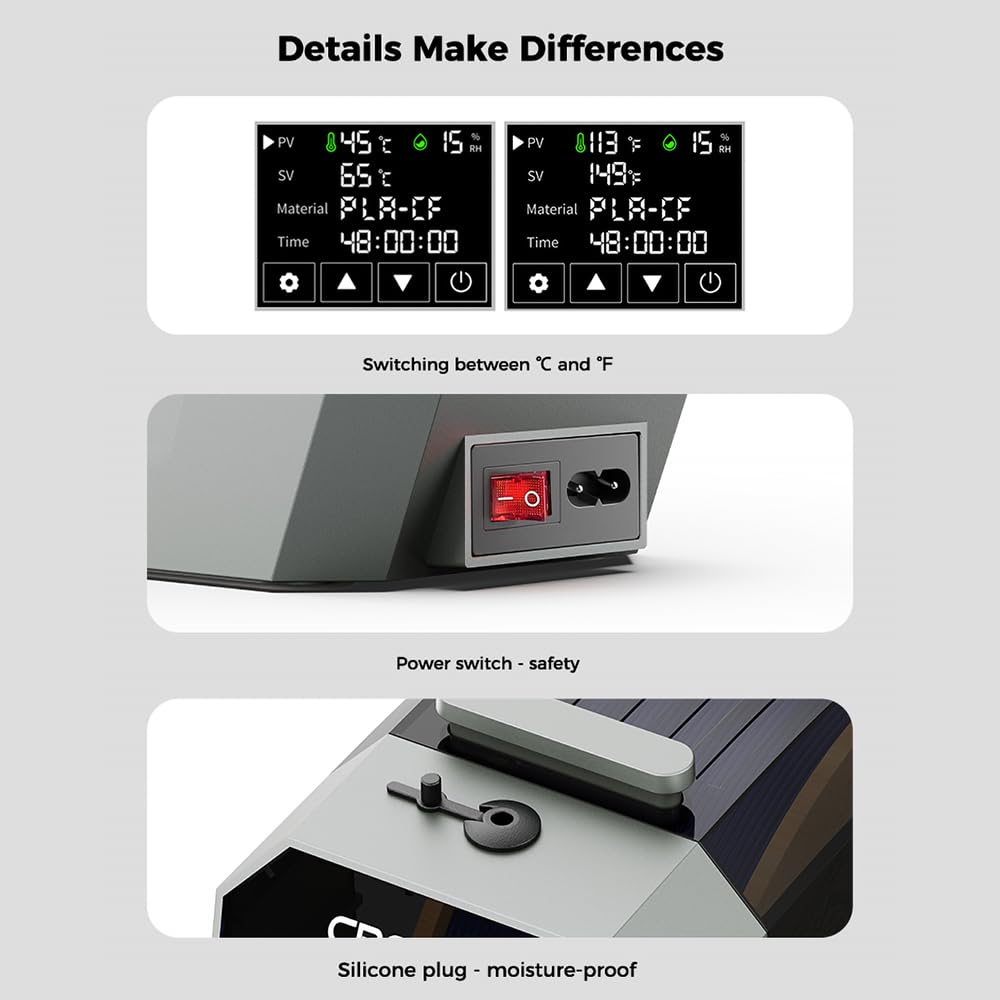- 【LCD Touch Screen for Simple Operation】The Creality Space Pi Filament Dry Box comes with a 3.7 inch touch screen which can clearly and brightly display temperature and time, making it simple for you to track drying conditions. Four separate control keys are convenient for navigation and use. The touch screen supports switching between ℃ and ℉ temperatures