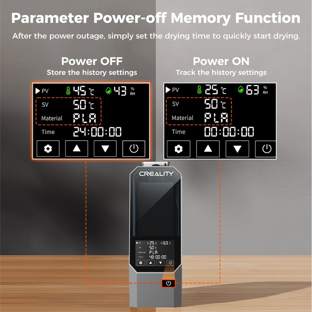 - 【Parameter Power-off Memory Function】After a power outage, the 3D filament dryer can restart and still remember your previous filament and temperature settings. Only setting the drying time can quickly restart drying