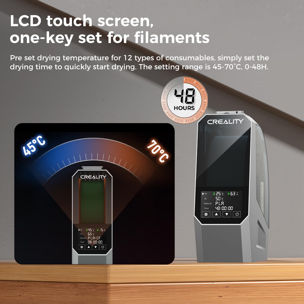 - 【One Key Setting for 12 Types of Filaments】This Creality filament dryer has one-key temperature settings for 12 types of filaments, including PLA, ABS, TPU, PETG, PP, PC, PA, PET, PLA-CF, PA-CF, PETG-CF, ASA. Of course, you can also freely adjust the temperature between 45-70°C. The heating duration can be freely set from 0-48 hours allowing the filaments to be fully dried for better printing results