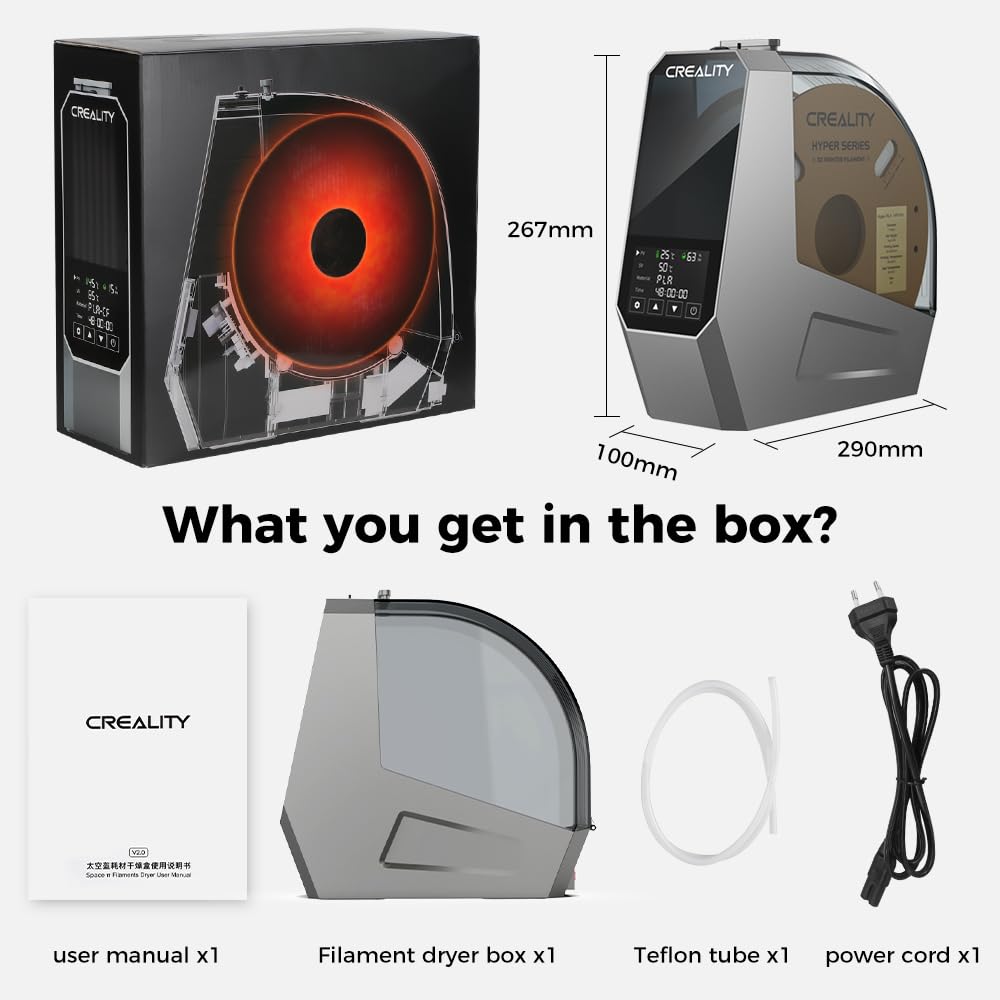 - 【Wide Compatibility】Creality Space Pi Dryer compatible with most 1KG spool 1.75mm/2.85mm 3D Printer filament. And can be used with a variety of common filaments, like PLA, PETG, TPU, ABS, even high-performance composite like PLA-CF, PA-CF, ASA