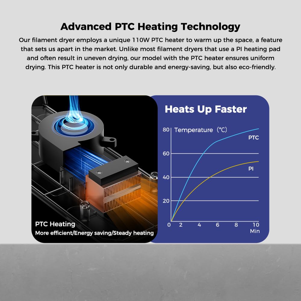 - 【Double PTC 360° Hot-air Heating】: The dryer quickly heats with a built-in fan,circulating hot air 360° for uniform heating effectively drying moisture filaments and improving printing results