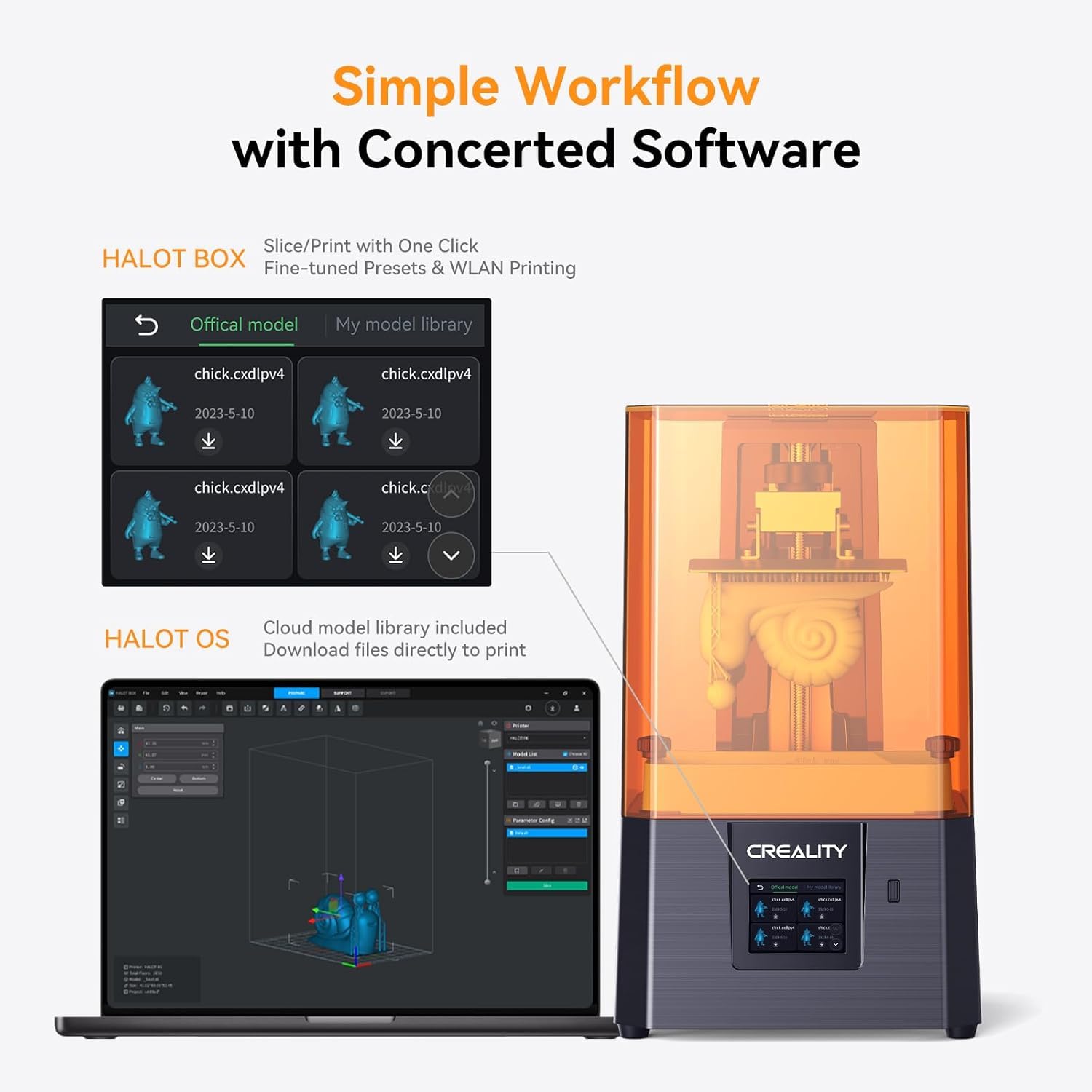- Multi-end Intelligent Collaboration: HALOT BOX software supports all kinds of parameter presets, and slicing and printing can be completed with one click; The Creality Cloud APP can download all kinds of models; The intelligent operation is simple and friendly; What's more surprising is that you don't need to pay anything to get the season card of CHITUBOX Pro