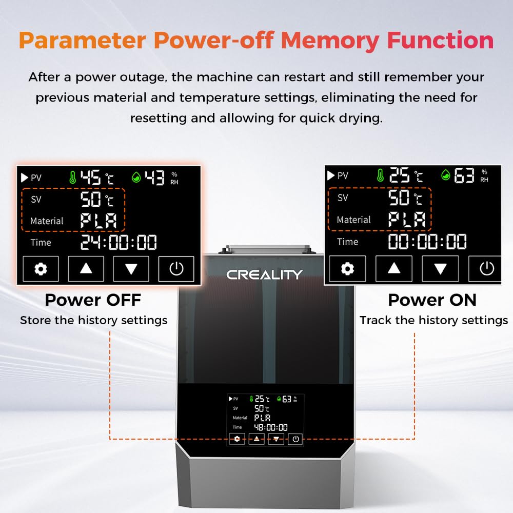 - 【Parameter Power-off Memory Function】Our filament dehydrator can restart and still remember your previous material and temperature settings after a power outage, saving you the trouble of resetting and ensuring fast drying