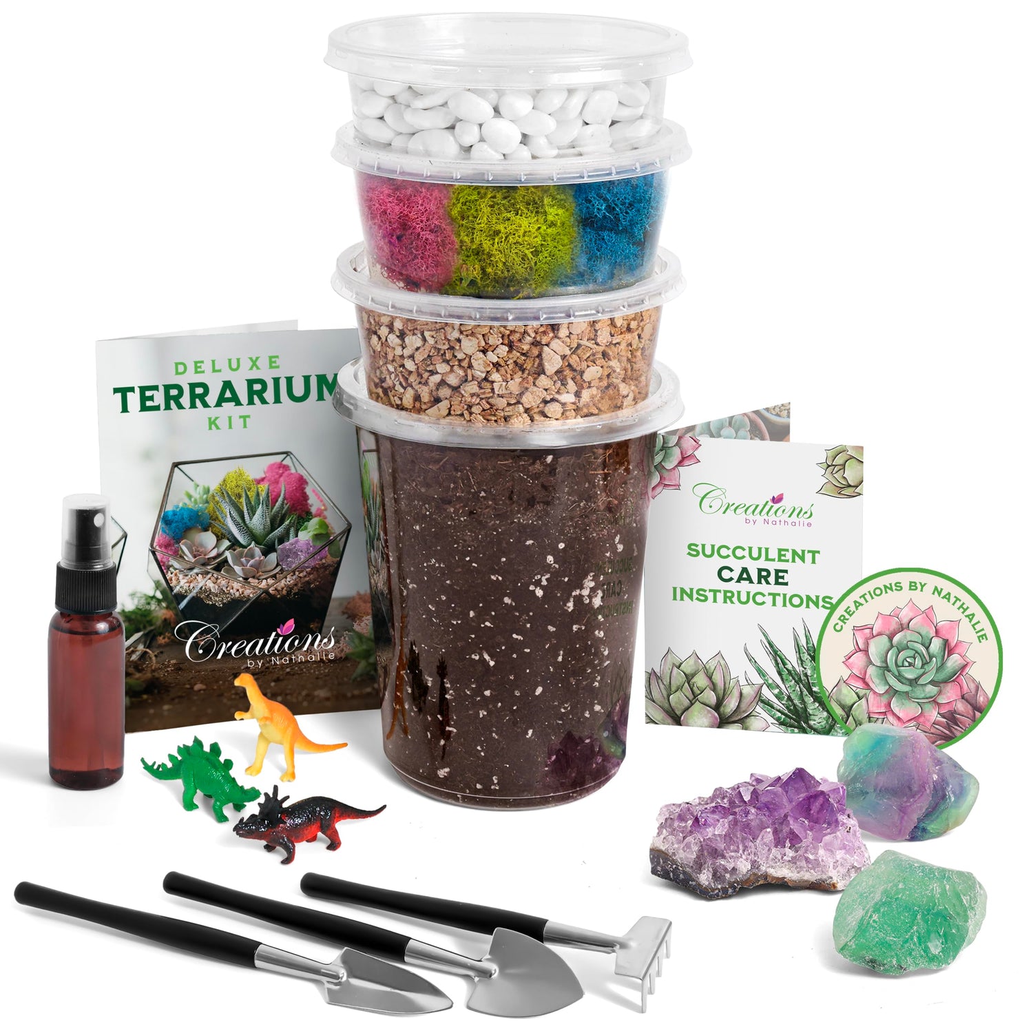 Creations by Nathalie – DIY Large Terrarium Starter Kit with Soil, Moss, Pebbles, Healing Crystal, Tools & Supplies – Terrarium Kit for Adults & Kids, Handcrafted in USA
