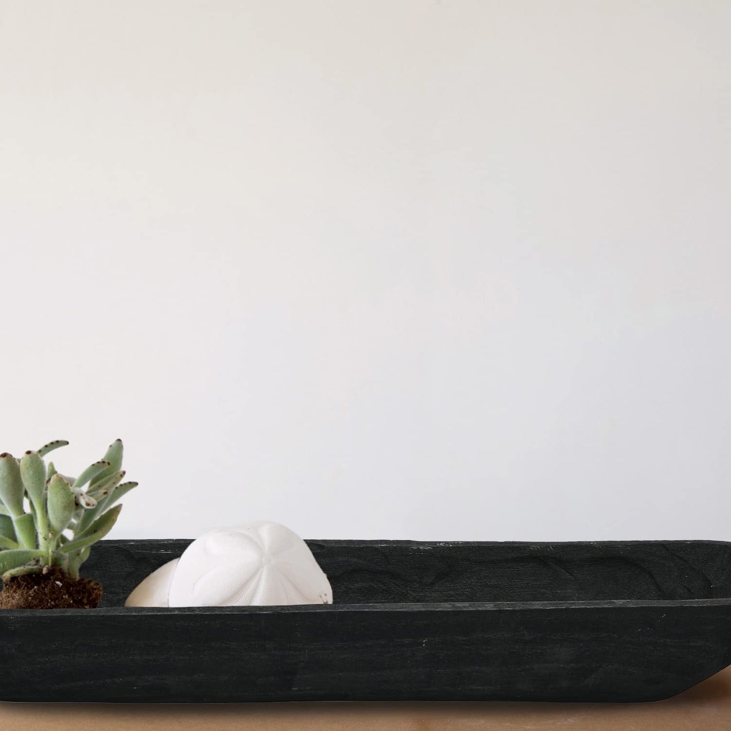 Details: Add a touch of organic texture to an entryway or bedroom with this boho-inspired tray; Place atop a console table or dresser to display jewelry, keys, or small decorative accents for the ultimate combination of style and function. Made of natural paulownia wood, this product has a wood grain texture and each will vary from another and from imagery. Bowl measures 22.75 inches L x 6 inches W x 3 inches H.