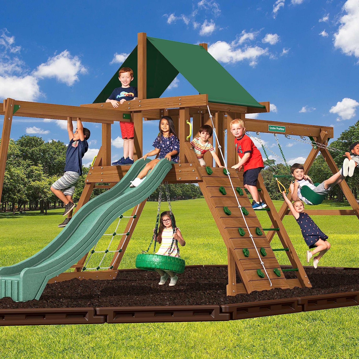 - Sturdy kids outdoor playset made from Southern Yellow Pine with rugged construction that's 60 percent heavier and stronger than China Fir used in imported playgrounds, all wooden components are prefinished with exterior Sherwin Williams stain sealer