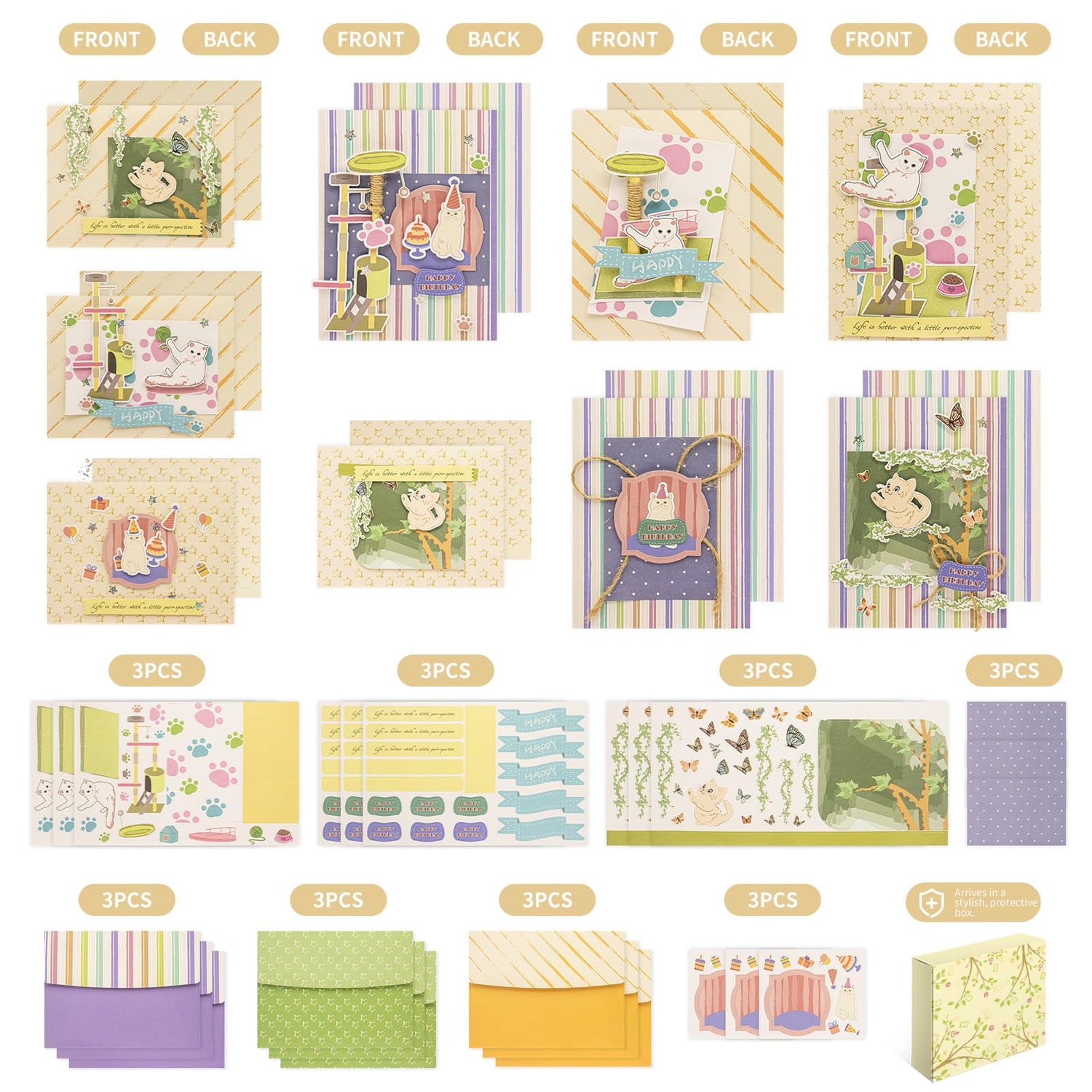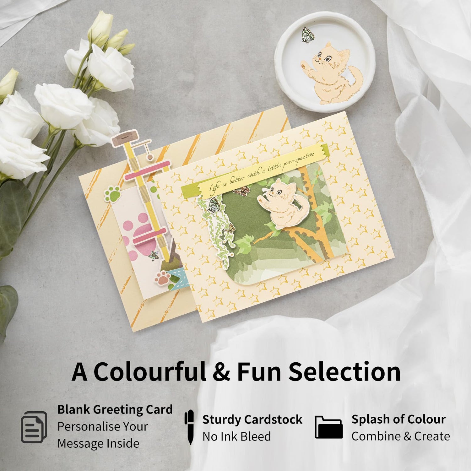 - 🐾Customizable Creative Greeting Card – Personalize your greeting cards by attaching "HAPPY," "Life is brtter with a little purr-spective " tags, cat tags, paw prints, butterflies, rhinestones, and jute twine!