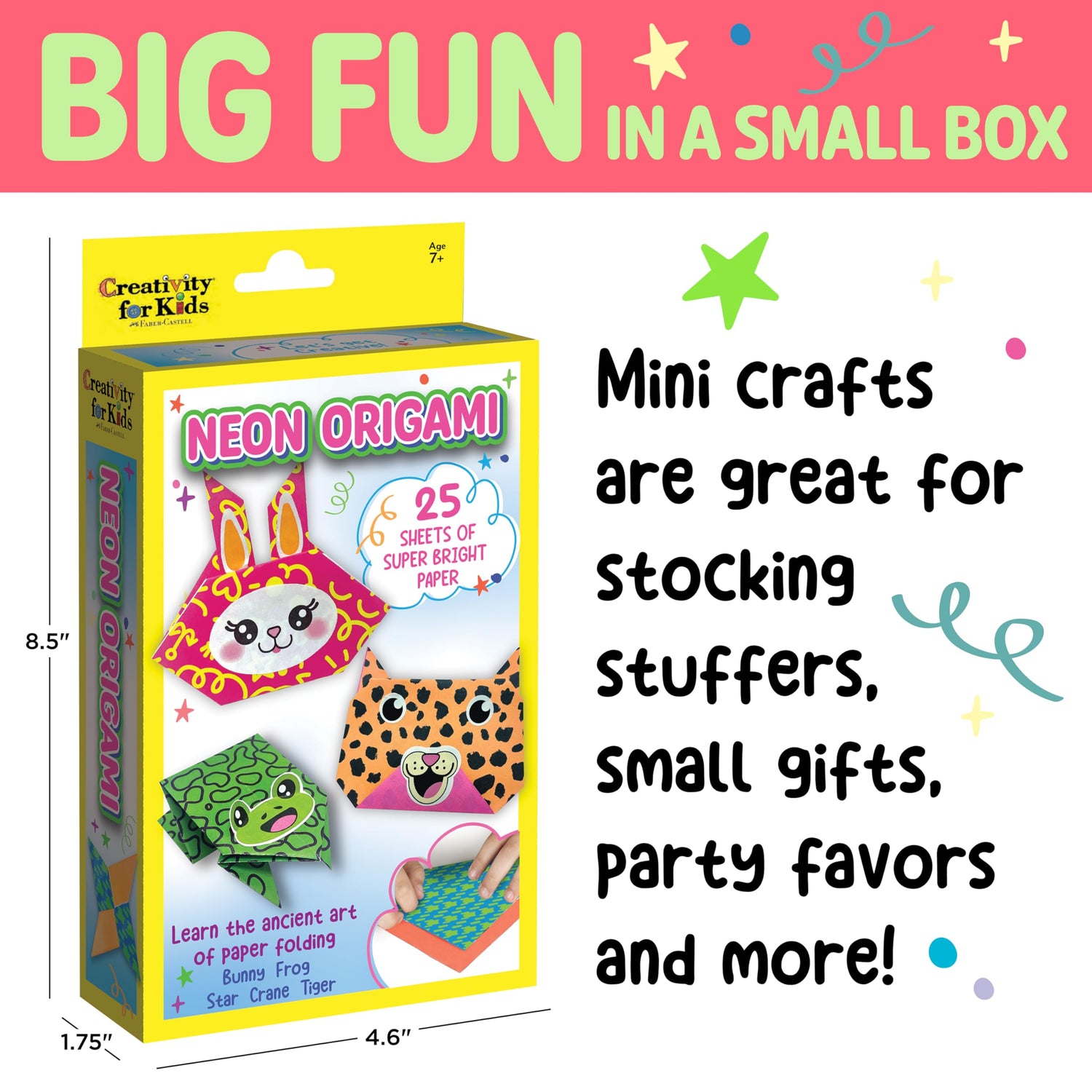 - SMALL GIFTS: Big fun in a small box! Give the gift of creativity with this neon Origami Mini Craft Kit. Perfect for kids stocking stuffer or for origami beginners, this classic kids craft offers hands-on, screen-free fun. This engaging arts and crafts kit for kids ages 8-12 promises hours of creativity!
